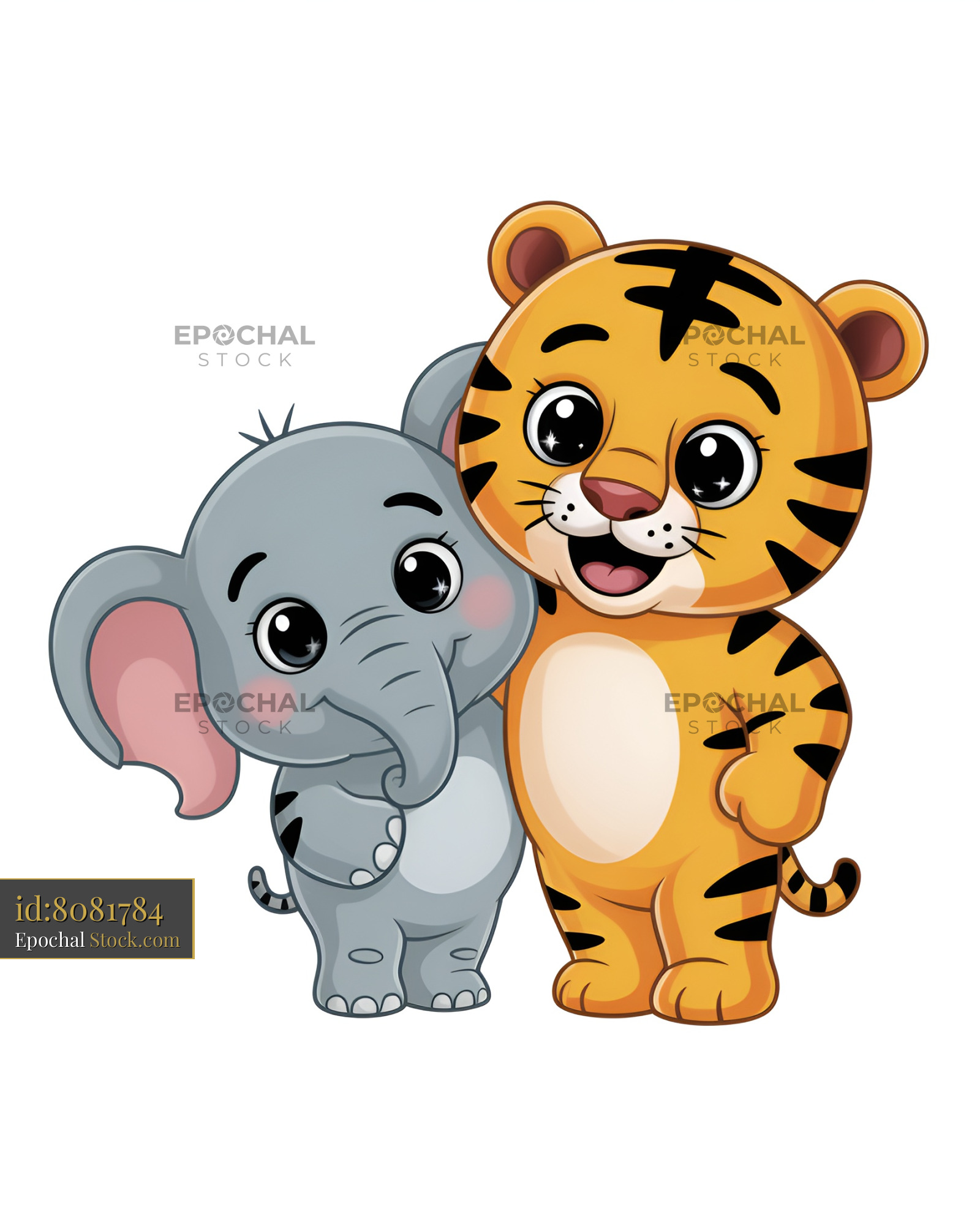 A small gray elephant and a smiling orange tiger stand close together. They show friendship and joy. The setting is colorful and bright. This scene captures a fun moment of animals.