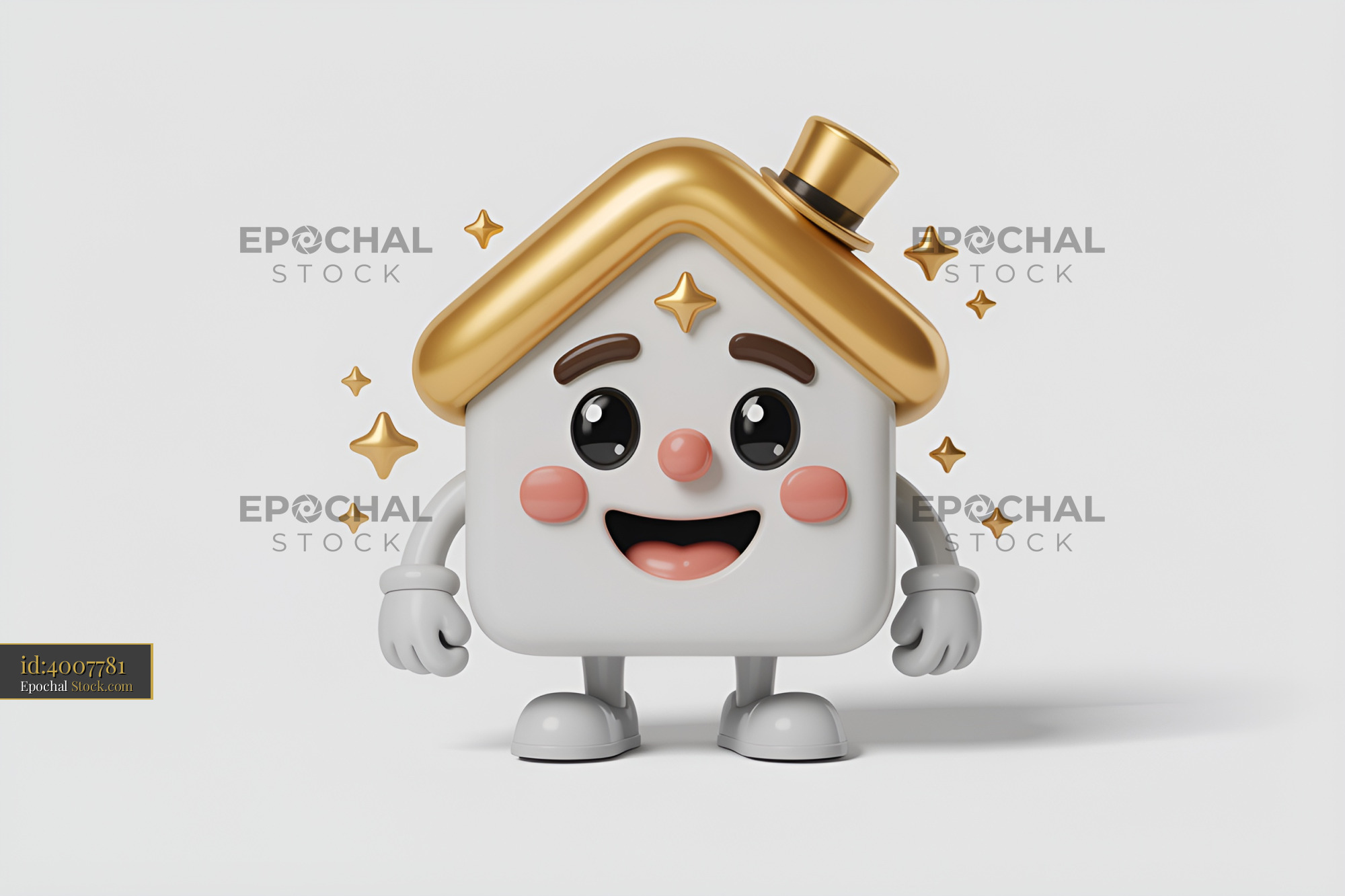 A happy house character with big eyes and a golden roof stands. It has a small top hat and sparkles around it. The setting is simple and bright, focusing on the character's features.