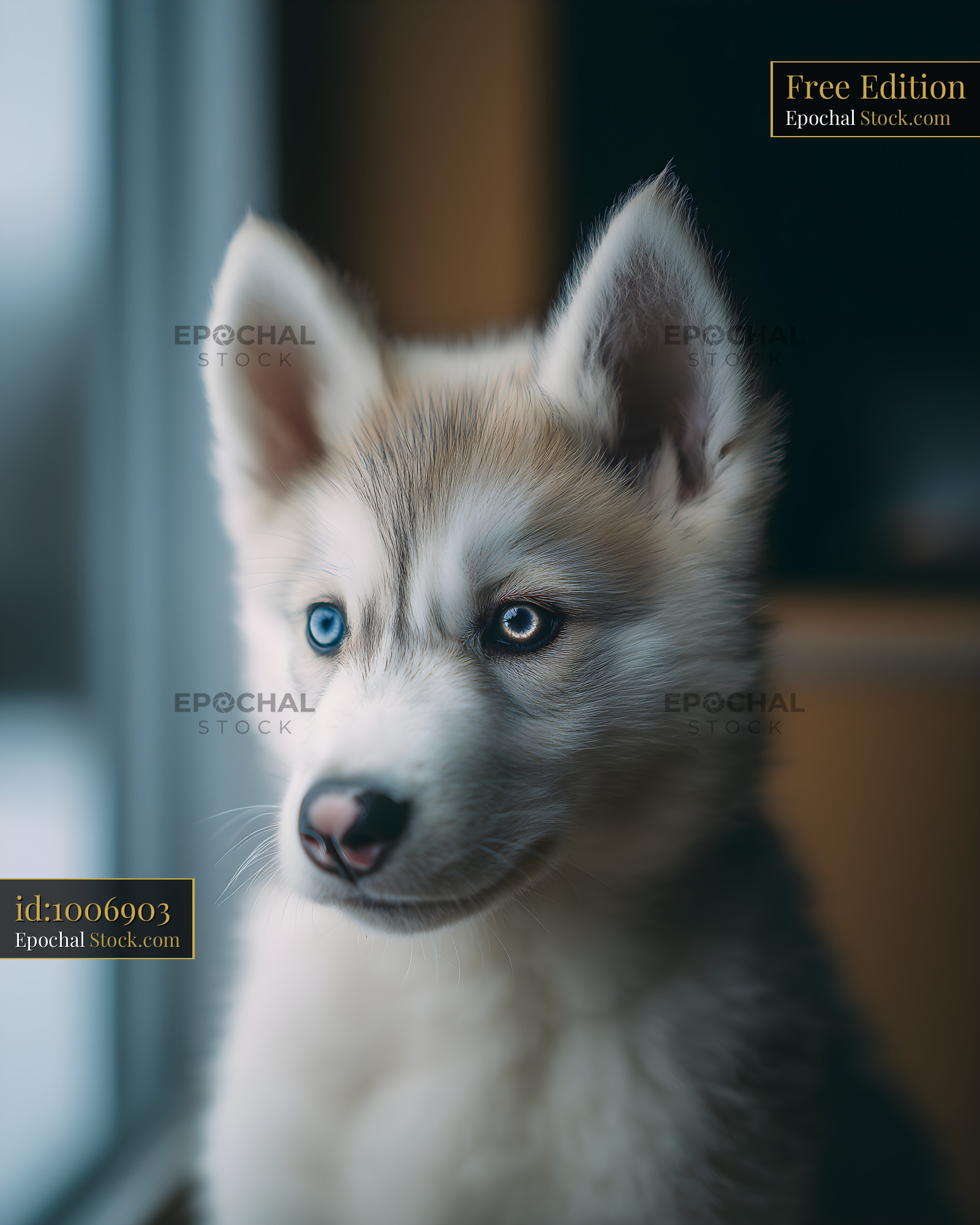 Cute husky puppy looks out the window in a cozy room Free Premium Stock Photo