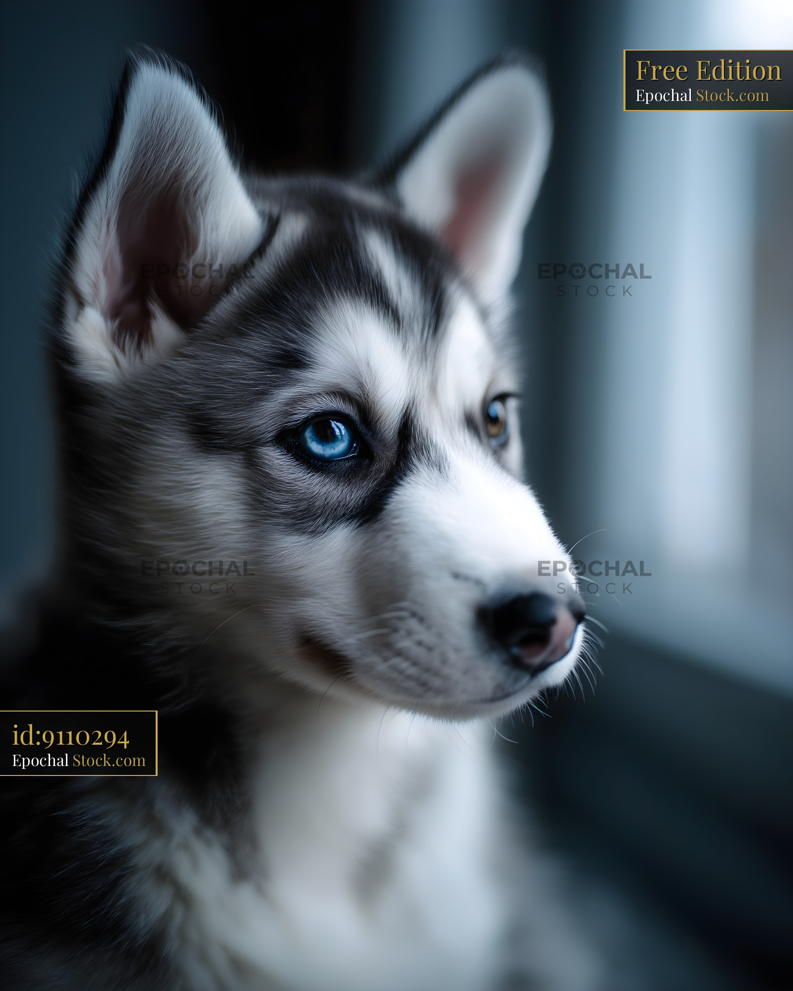 A husky puppy is sitting near a window with soft light shining on its fur. The puppy has striking blue eyes and looks curious as it gazes outside.