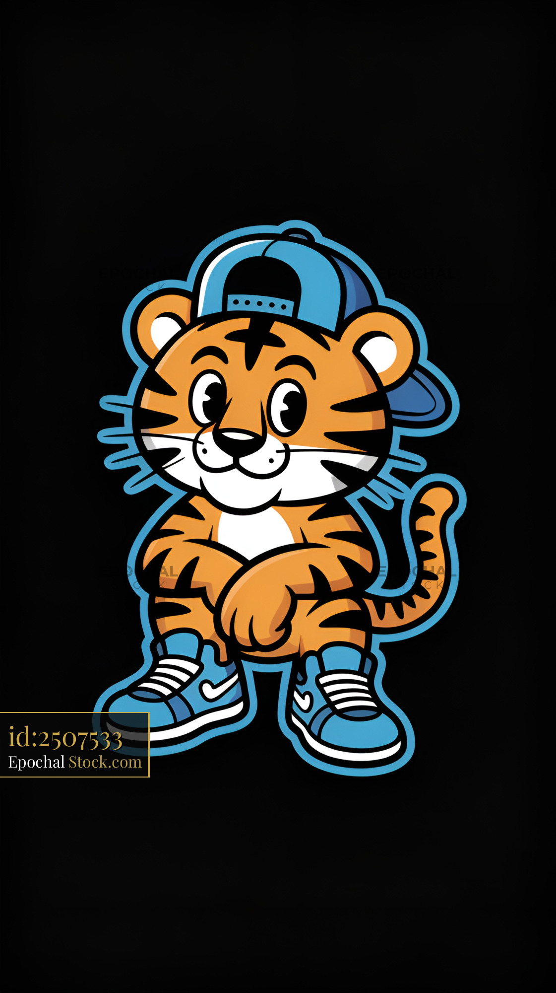 A cartoon character of a tiger stands with its arms crossed. The tiger wears a blue cap and sneakers. The background is black, which makes the colors stand out.