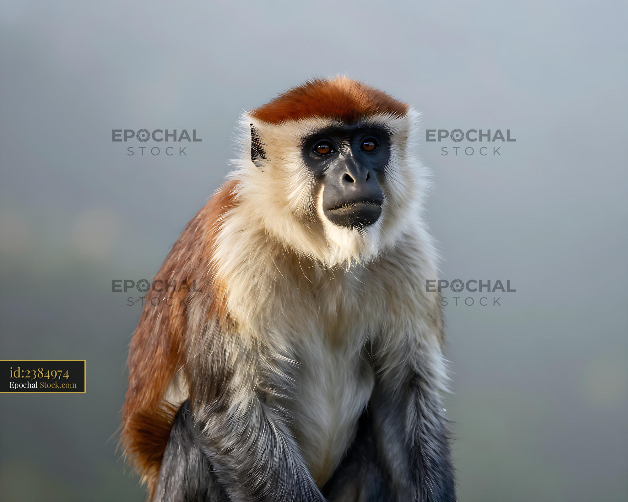 De Brazza's monkey with white beard and orange crown in soft light
