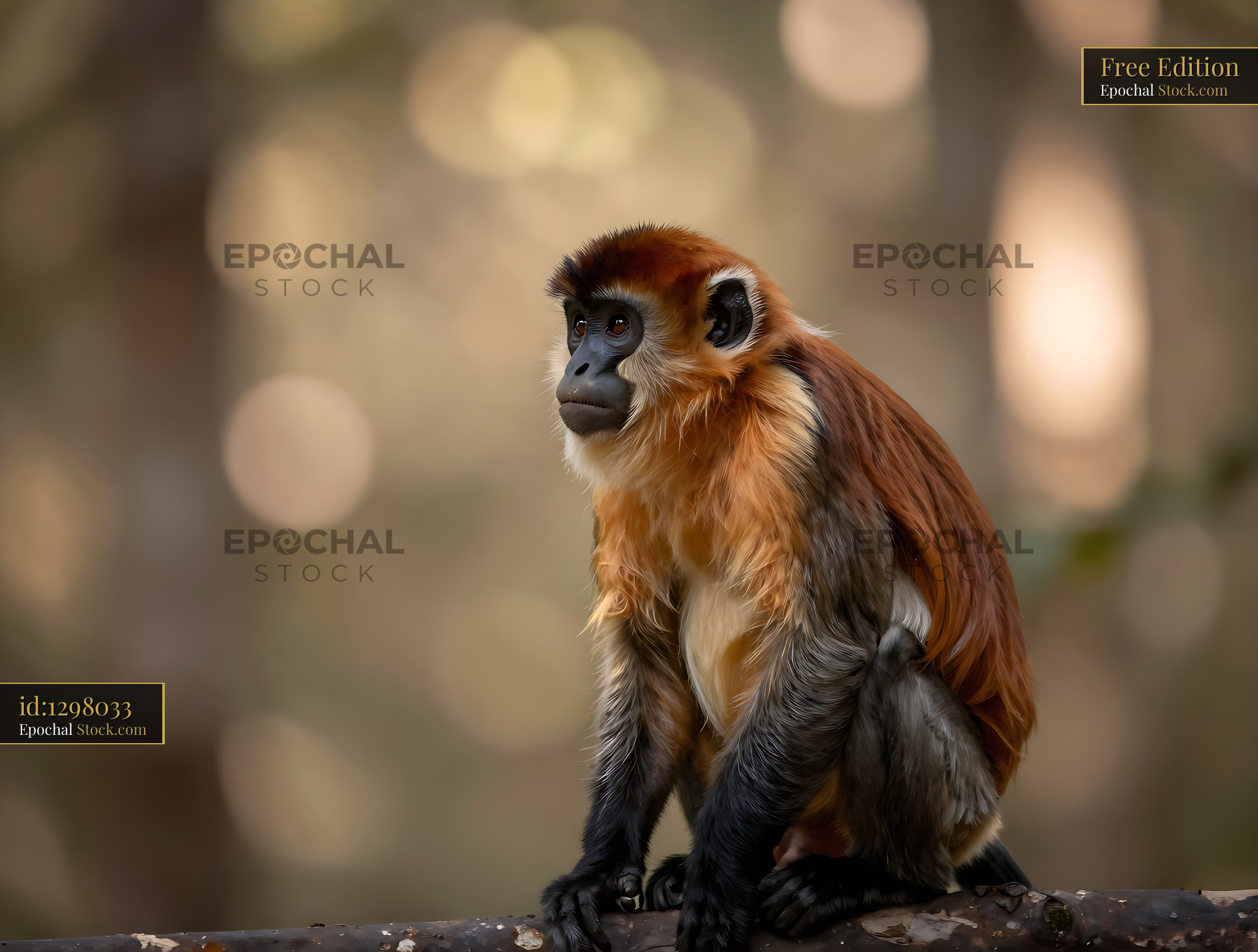 A De Brazzas monkey rests thoughtfully on a wooden branch, surrounded by the soft bokeh of a lush jungle, capturing a moment of quiet observation and natural beauty.