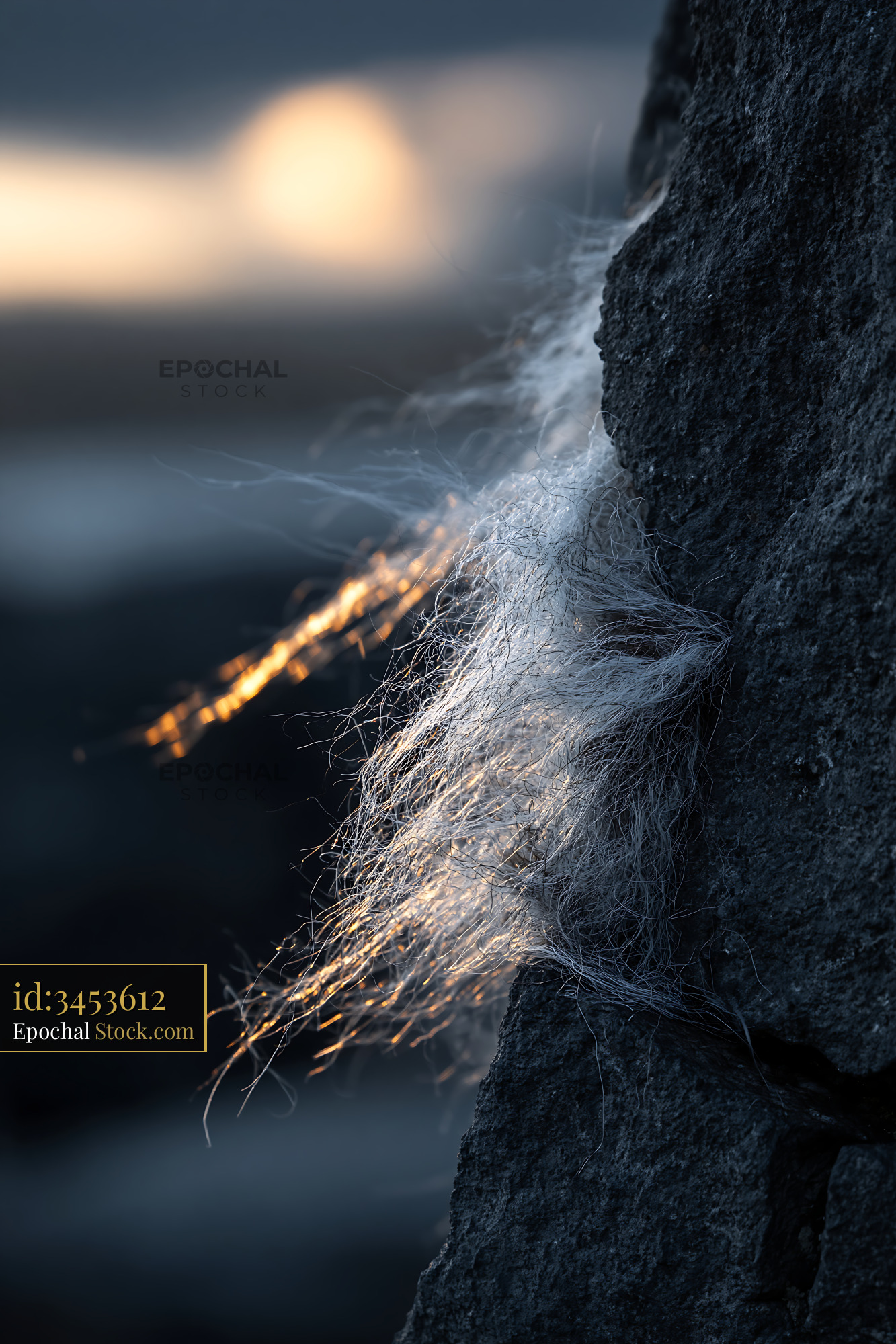 Fine, wispy white strands catch golden sunlight as they cling to a rough stone surface, creating a poignant contrast between fragility and permanence. The soft, glowing fibers against dark rock evoke themes of resilience, persistence, and hope persisting in harsh conditions.