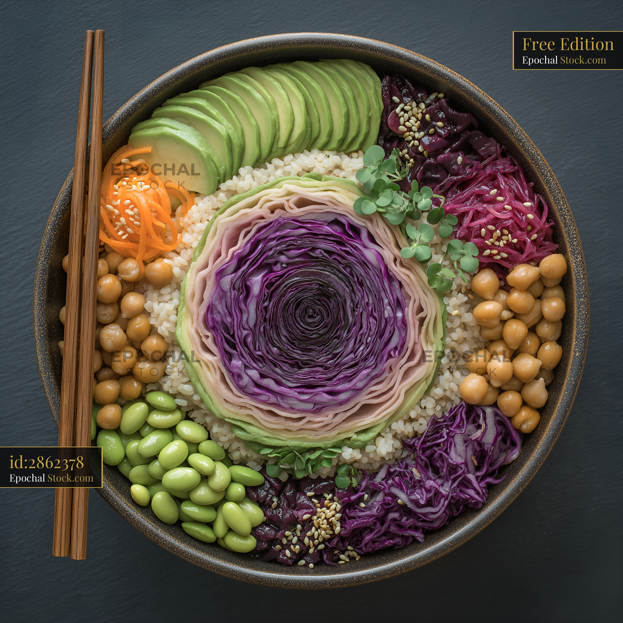 A bowl is filled with colorful vegetables and grains. There are layers of cabbage, rice, and sliced avocado arranged neatly. It is set on a dark surface with chopsticks beside it.