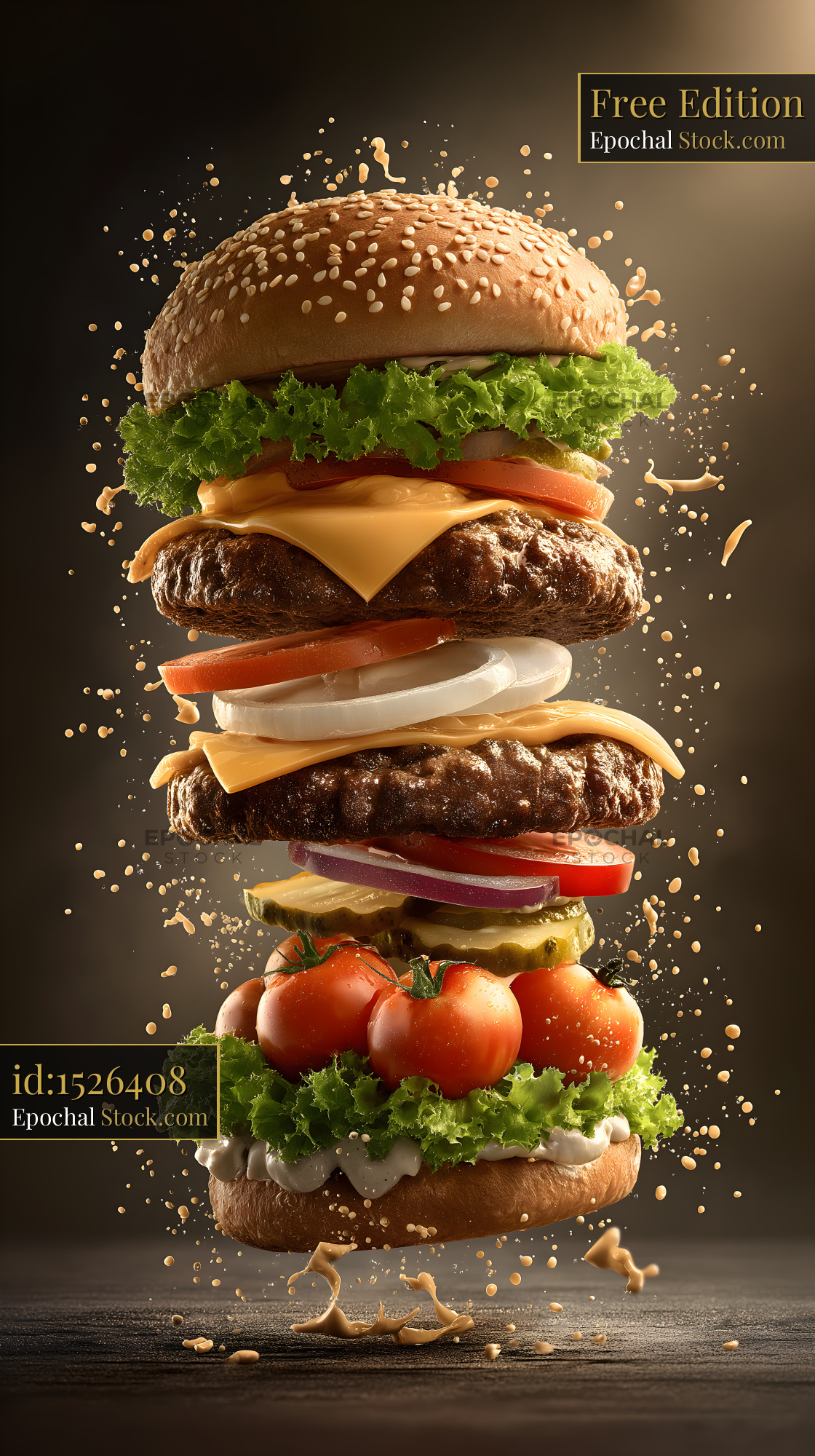 Delicious burger with layers of meat, cheese, and vegetables Free Premium Stock Image
