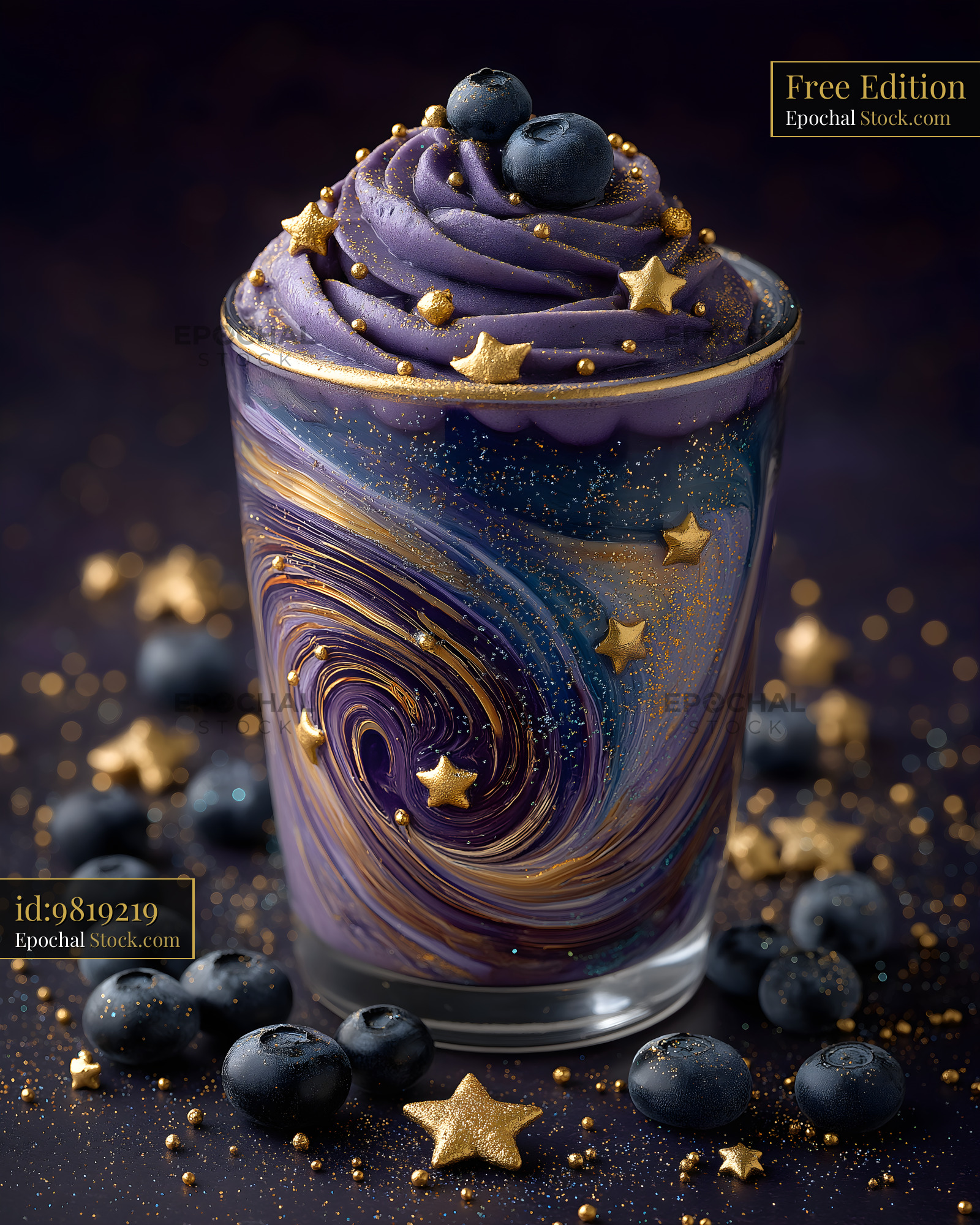 A dessert is served in a transparent glass. The dessert has purple swirls and is topped with berries and gold stars. Blueberries are placed around the glass on a dark surface.
