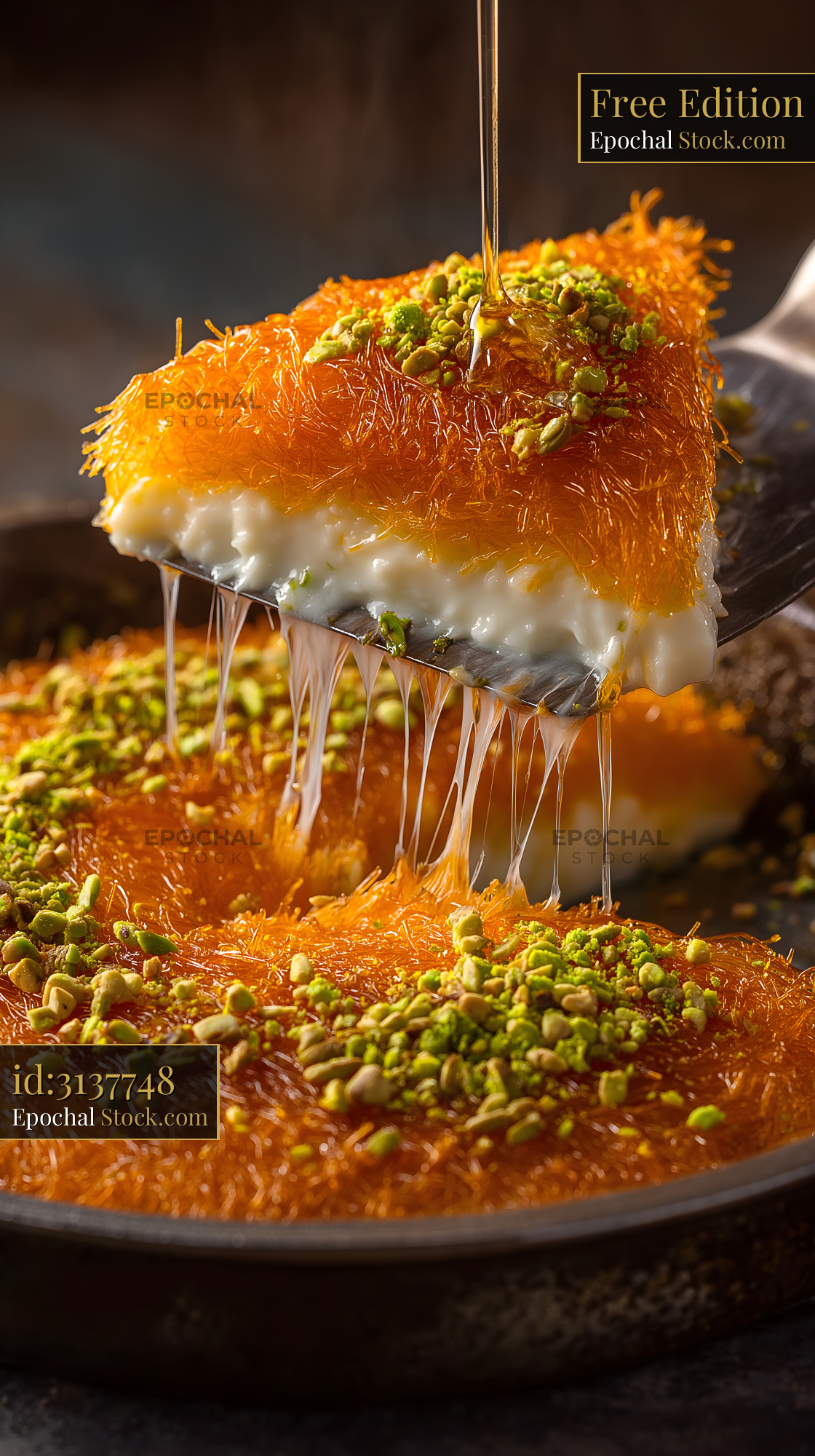 A dessert is being served from a plate, showing layers of sweet dough and cheese. Syrup is being poured over the dish while pistachios add a nice topping. This dish is warm and appealing.