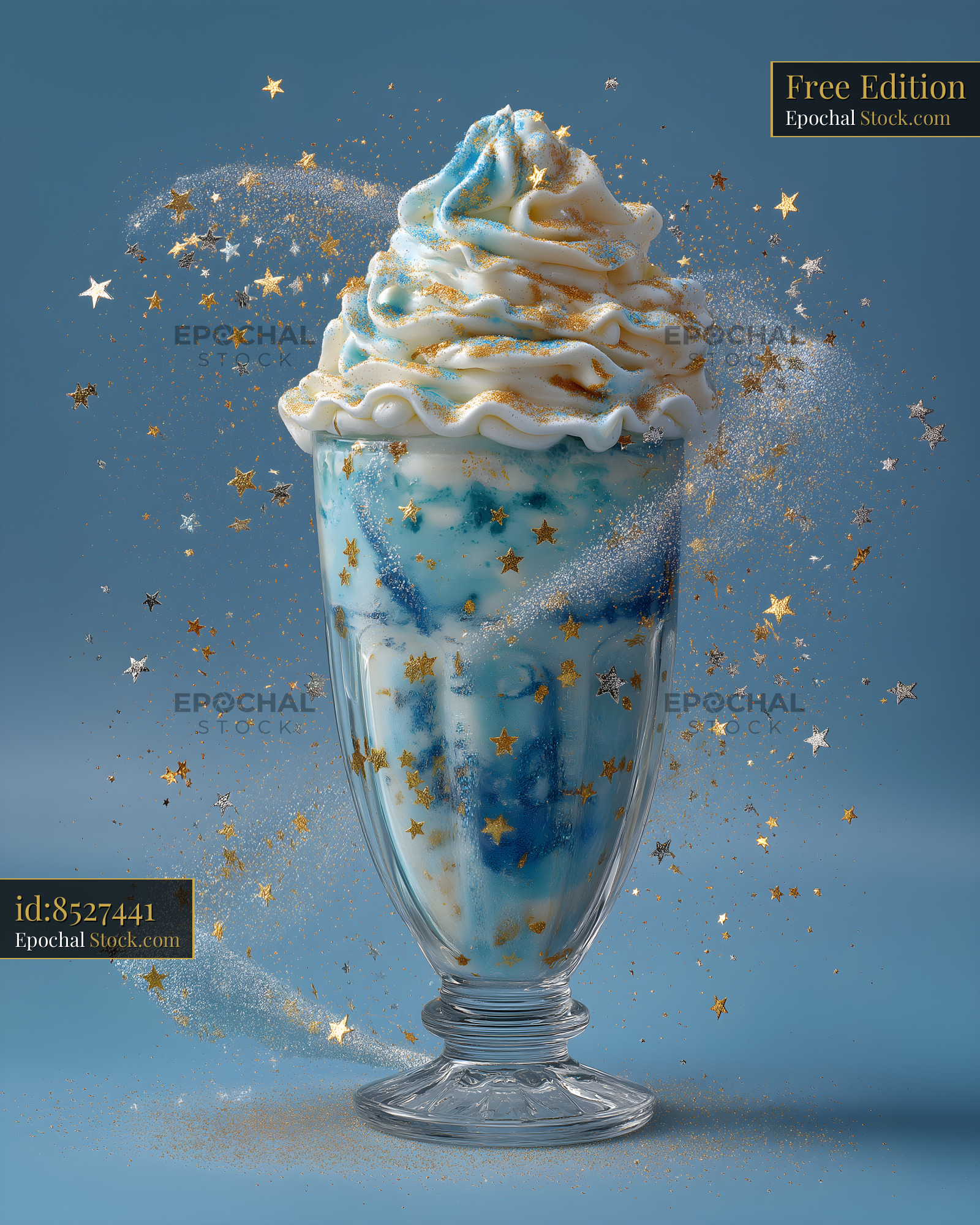 A dessert cup filled with blue layers is topped with whipped cream. Golden stars surround the cup, giving a festive look. This sweet treat stands out against a blue background.
