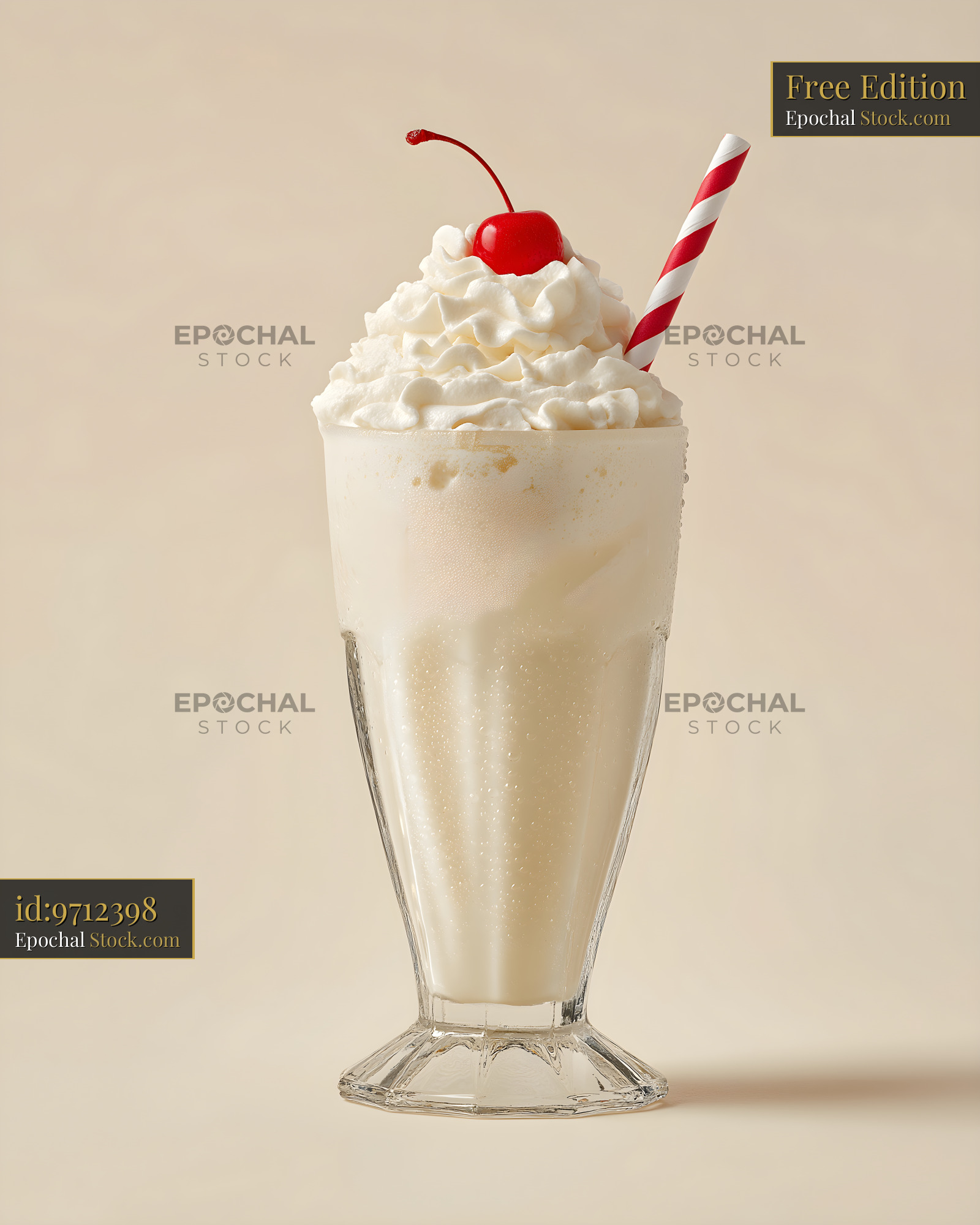 A tall glass holds a milkshake topped with whipped cream and a cherry. A red and white straw stands out against the cream. The setting is simple and inviting.