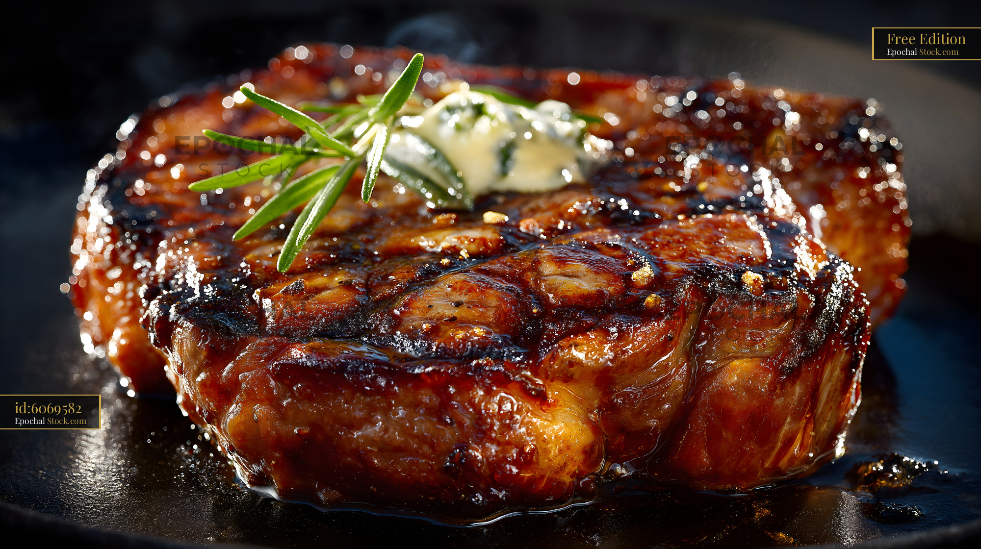 Delicious steak grilling with herbs in a kitchen setting Free Premium Stock Image