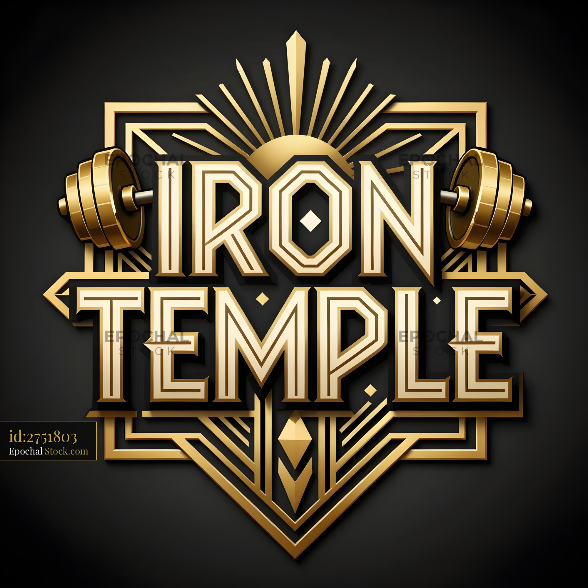The logo shows the words Iron Temple with gold color. It has a sun and weights on each side. The design has sharp lines and shapes, adding to the gym theme.