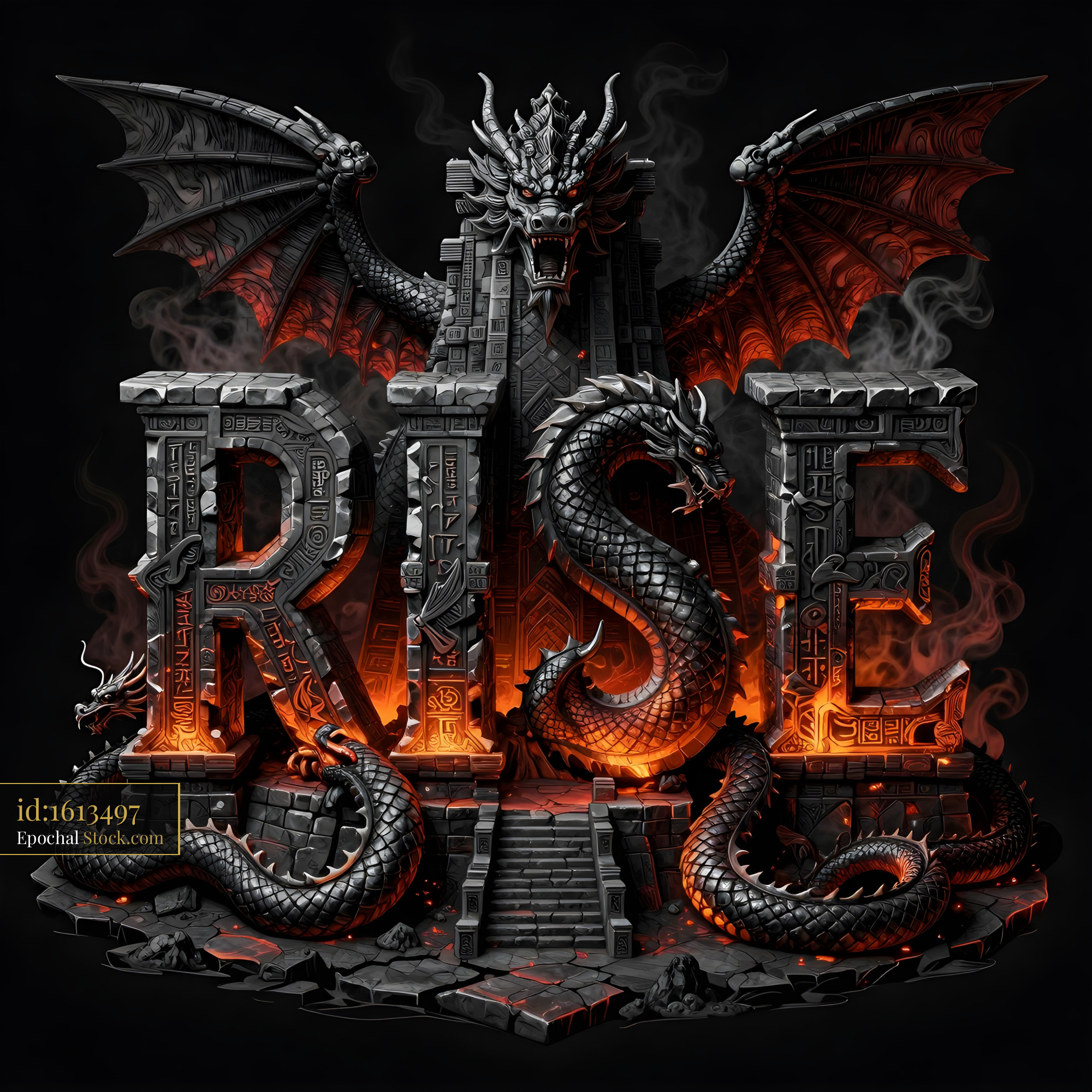 A dragon scene shows a large stone structure with letters that spell rise. Dragons and smoke surround the letters. The setting is dark and the atmosphere is intense.