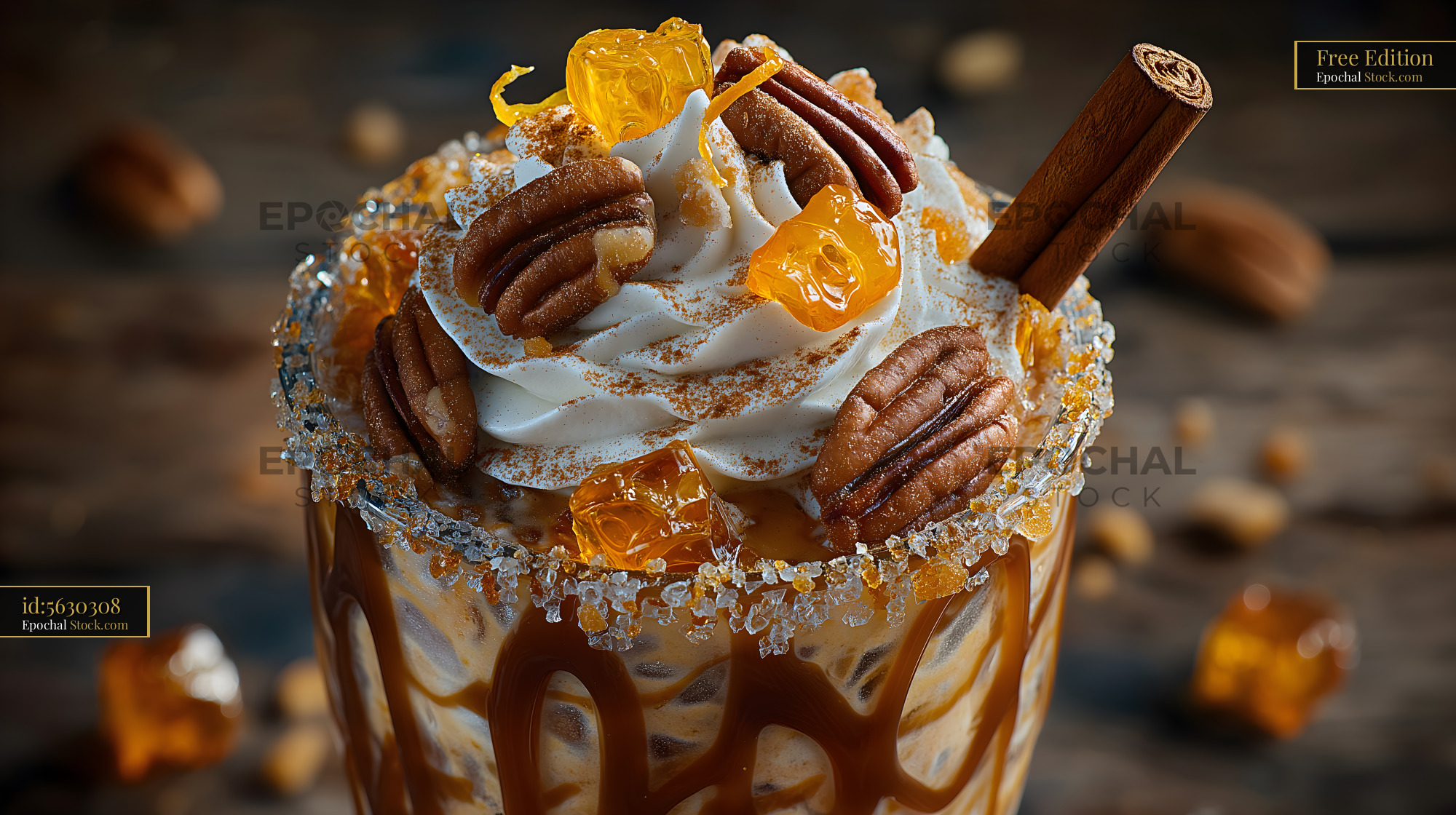 Dessert drink topped with nuts and candy pieces on table Free Premium Stock Image