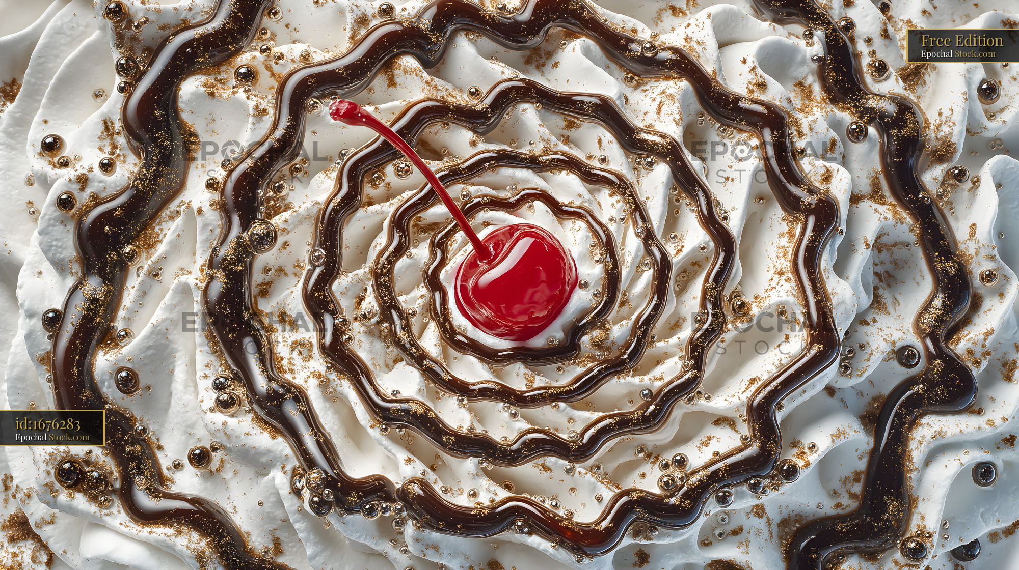 A dessert is prepared with a base of whipped cream that has a spiral design in chocolate sauce. A bright cherry sits at the center, adding color to the dish.