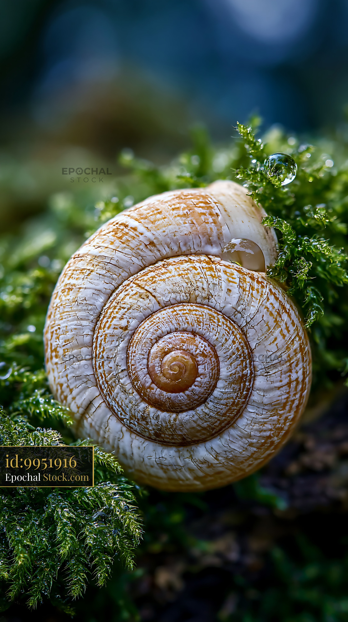 Detailed snail shell resting on vibrant green wet moss with dew drops