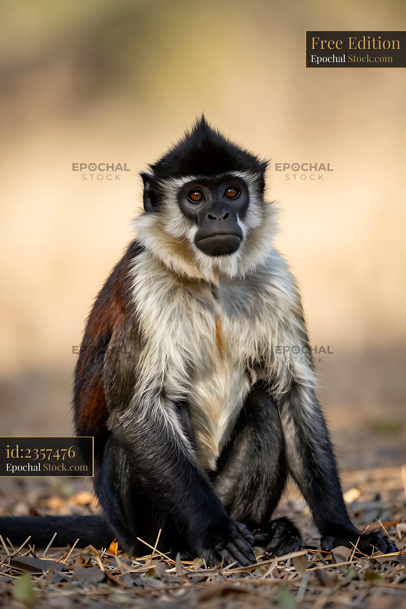 Diana monkey sitting on the forest floor in natural light
