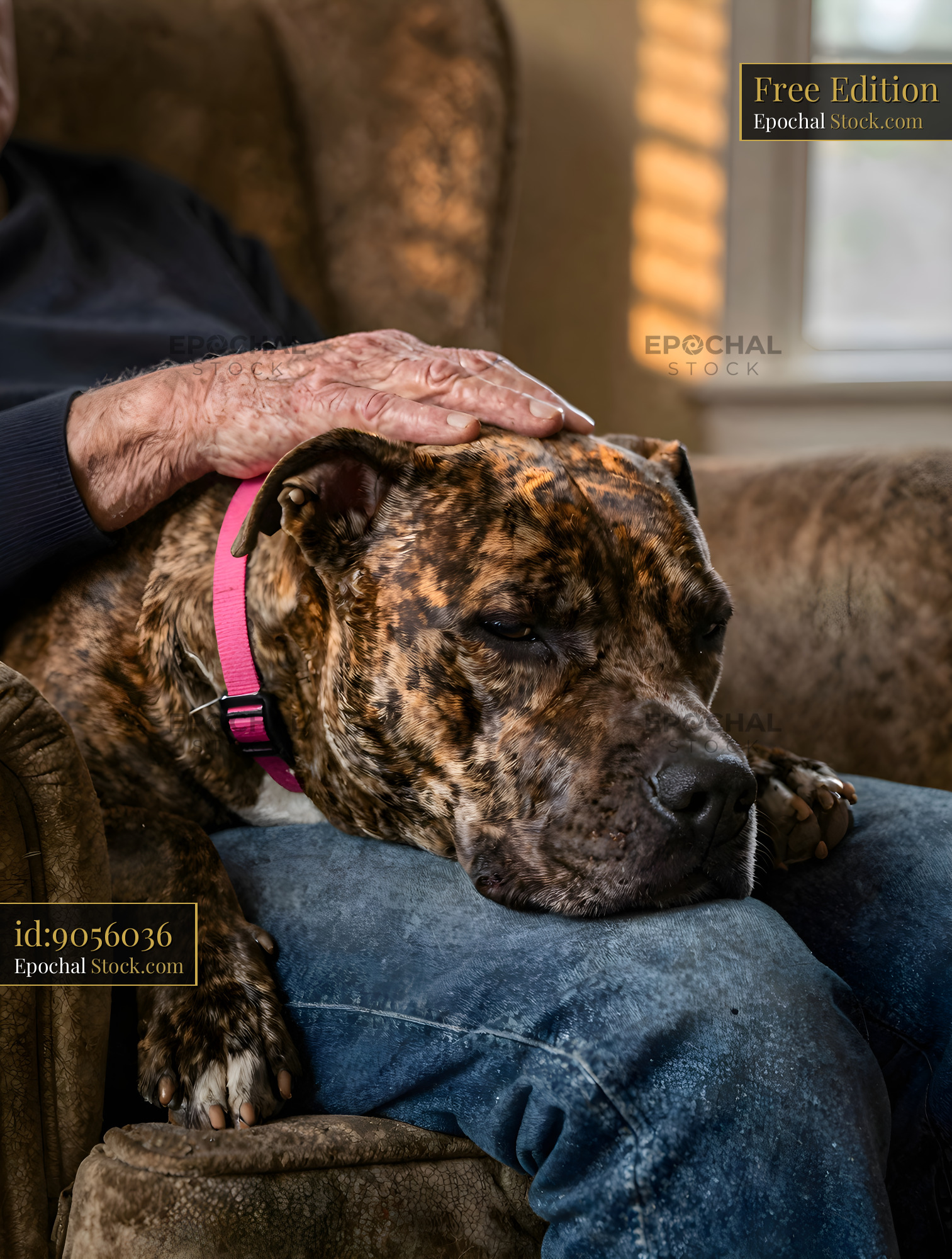 A dog with a striped coat rests its head on the lap of a person sitting in a chair. Sunlight comes through the window. The person gently pets the dog. The setting is a living room.