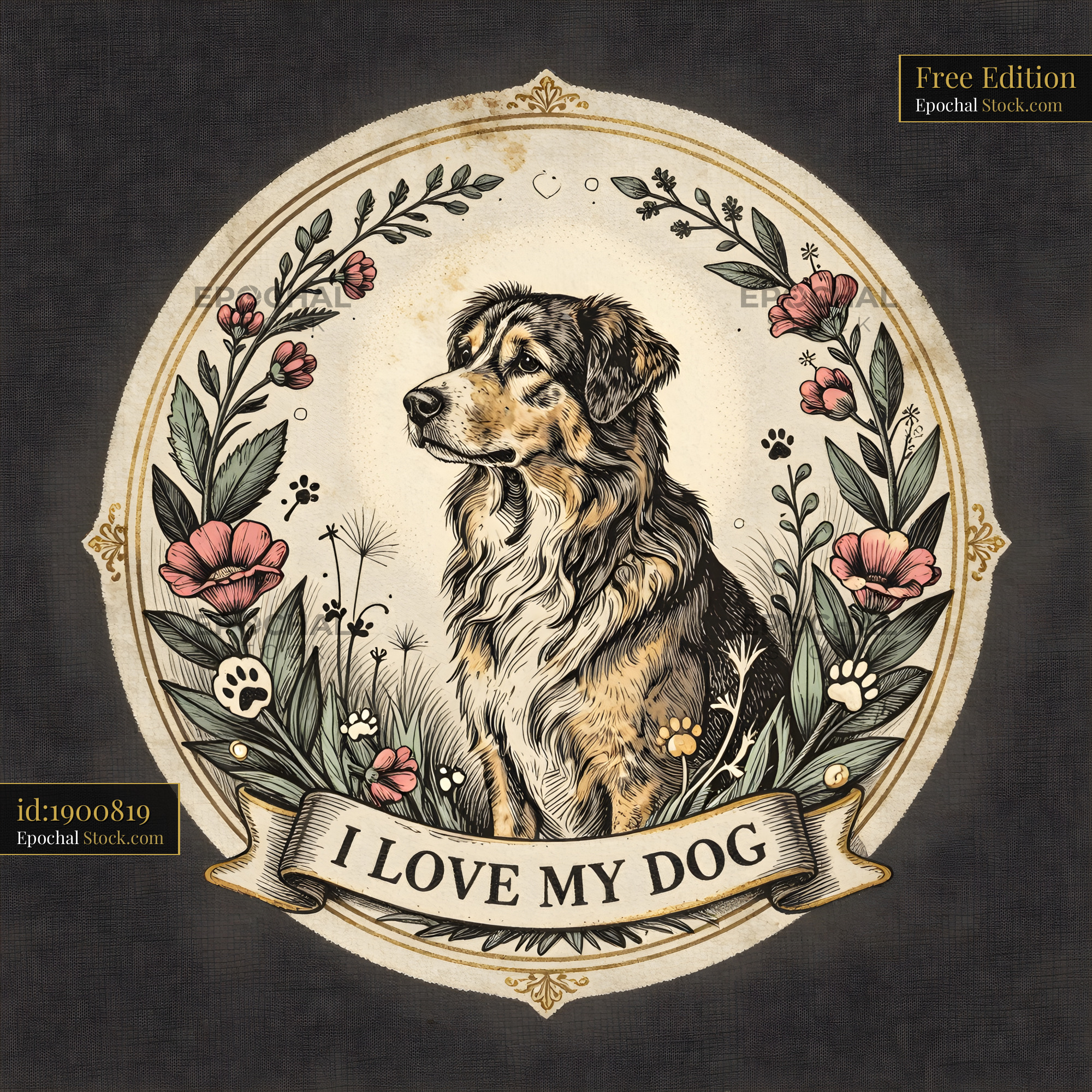 Dog surrounded by flowers with a message of love in the design Free Premium Stock Photo