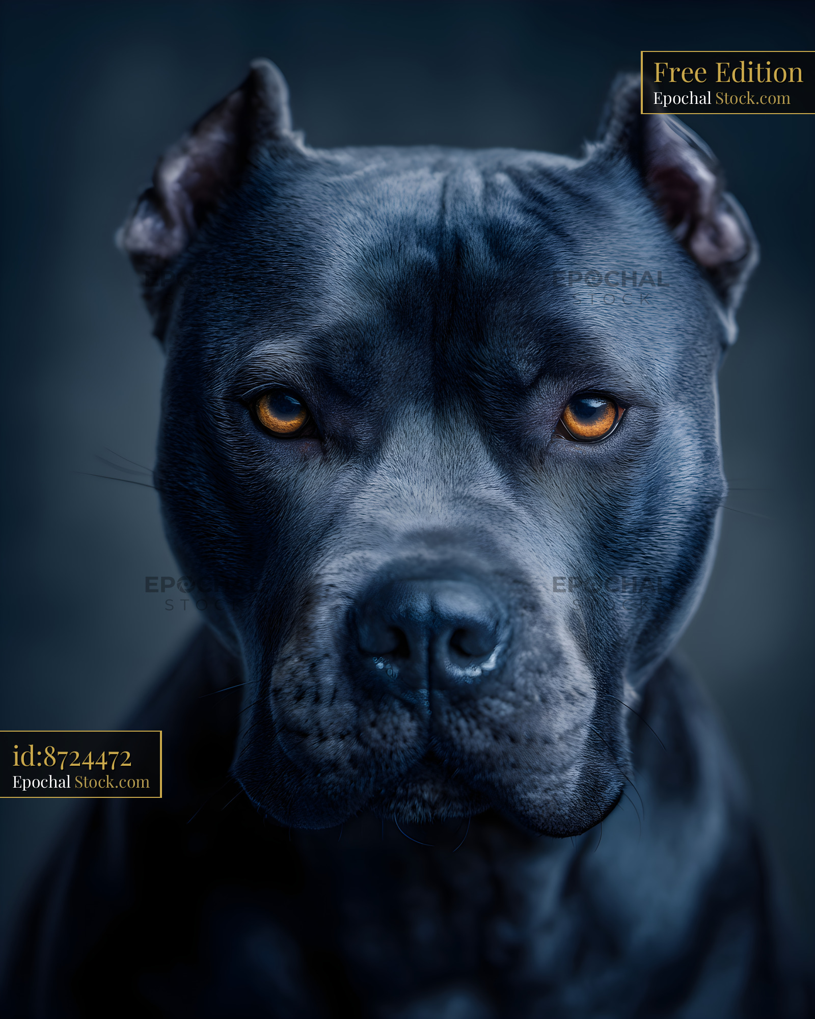 A dog with dark fur looks directly at the viewer with amber eyes. The background is dark, which draws attention to the dog's strong features and expression.