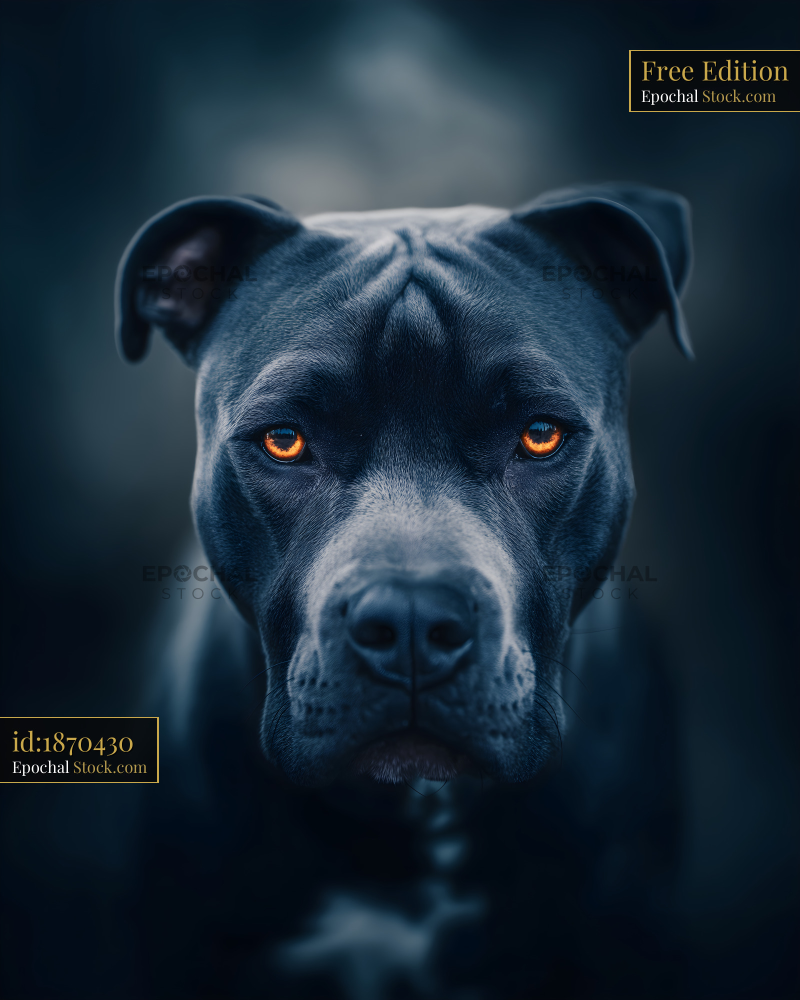 A dog stands in a blurred background. Its fur is dark and smooth. The eyes have a bright orange shade. The setting is unclear, focusing on the dog's strong expression.