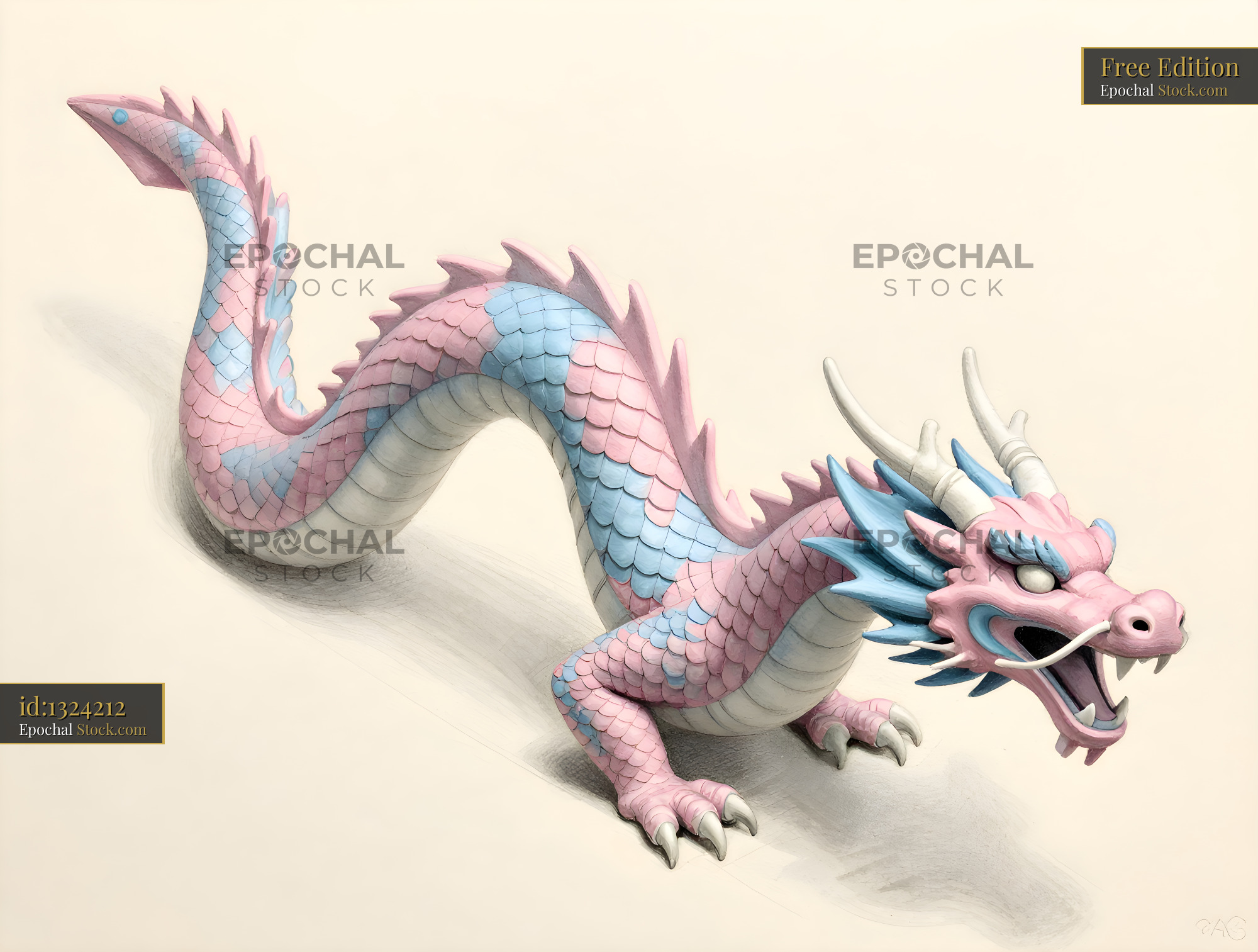 A detailed dragon sculpture rests on a light surface. The dragon has a long body with scales in pink and blue. Its head features horns and an open mouth, showing fierce teeth.