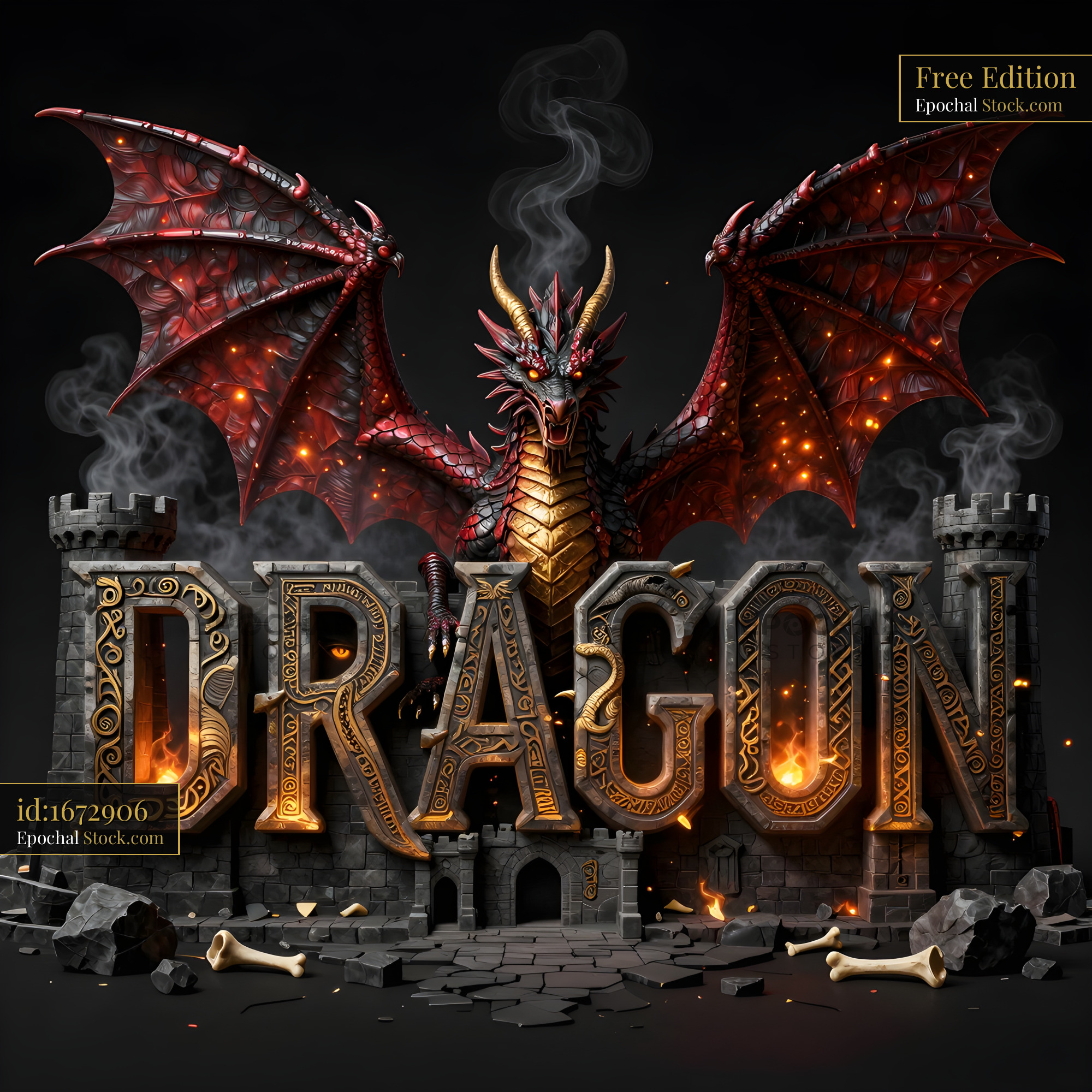 A large dragon with red and gold scales stands behind castle walls. Flames and smoke surround the dragon. The word DRAGON is carved in stone at the base.