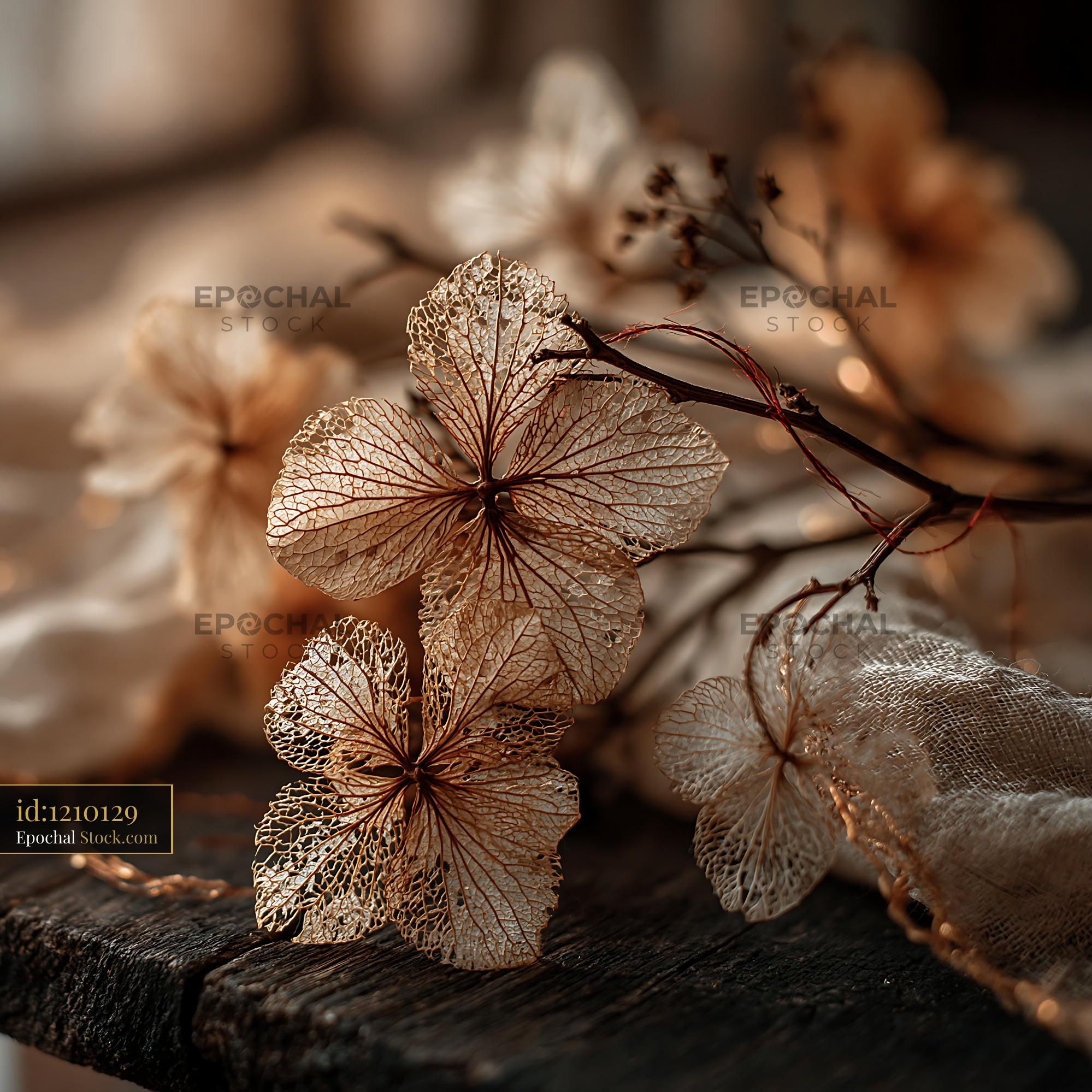 Delicate skeletonized hydrangea flowers rest on a dark rustic wooden table, bathed in soft golden light, evoking a sense of fragility, nostalgia, and the beauty of transience.
