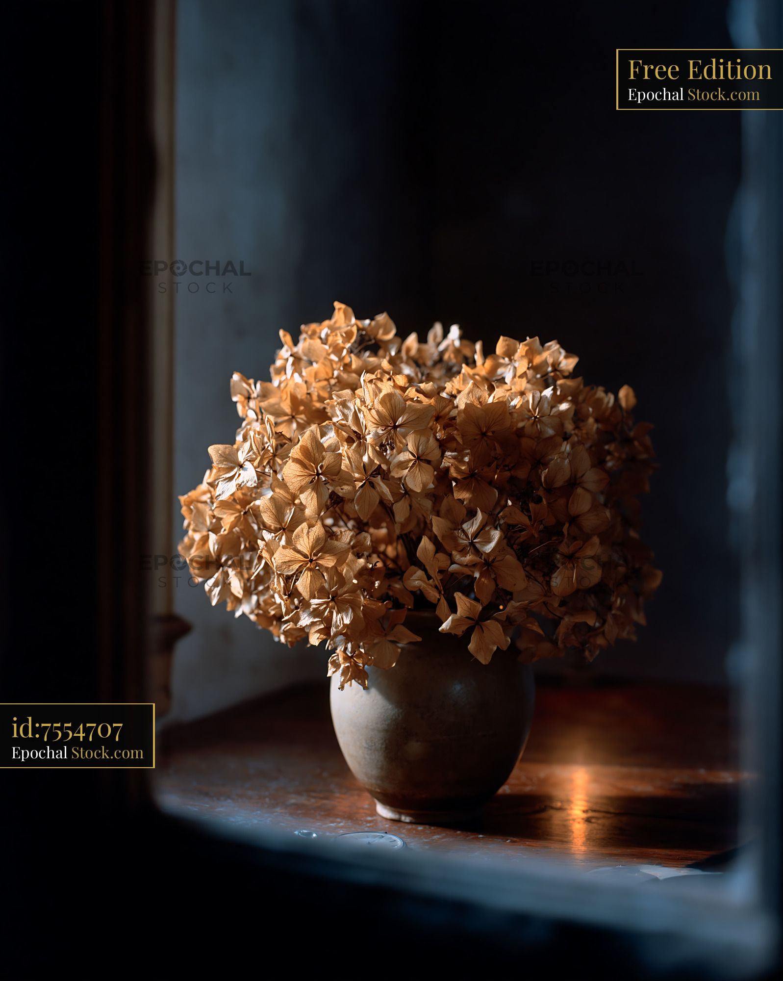 Moody still life of withered hydrangeas in a ceramic vase, symbolizing the quiet isolation of winter and the fading memory of footprints in deep snow.