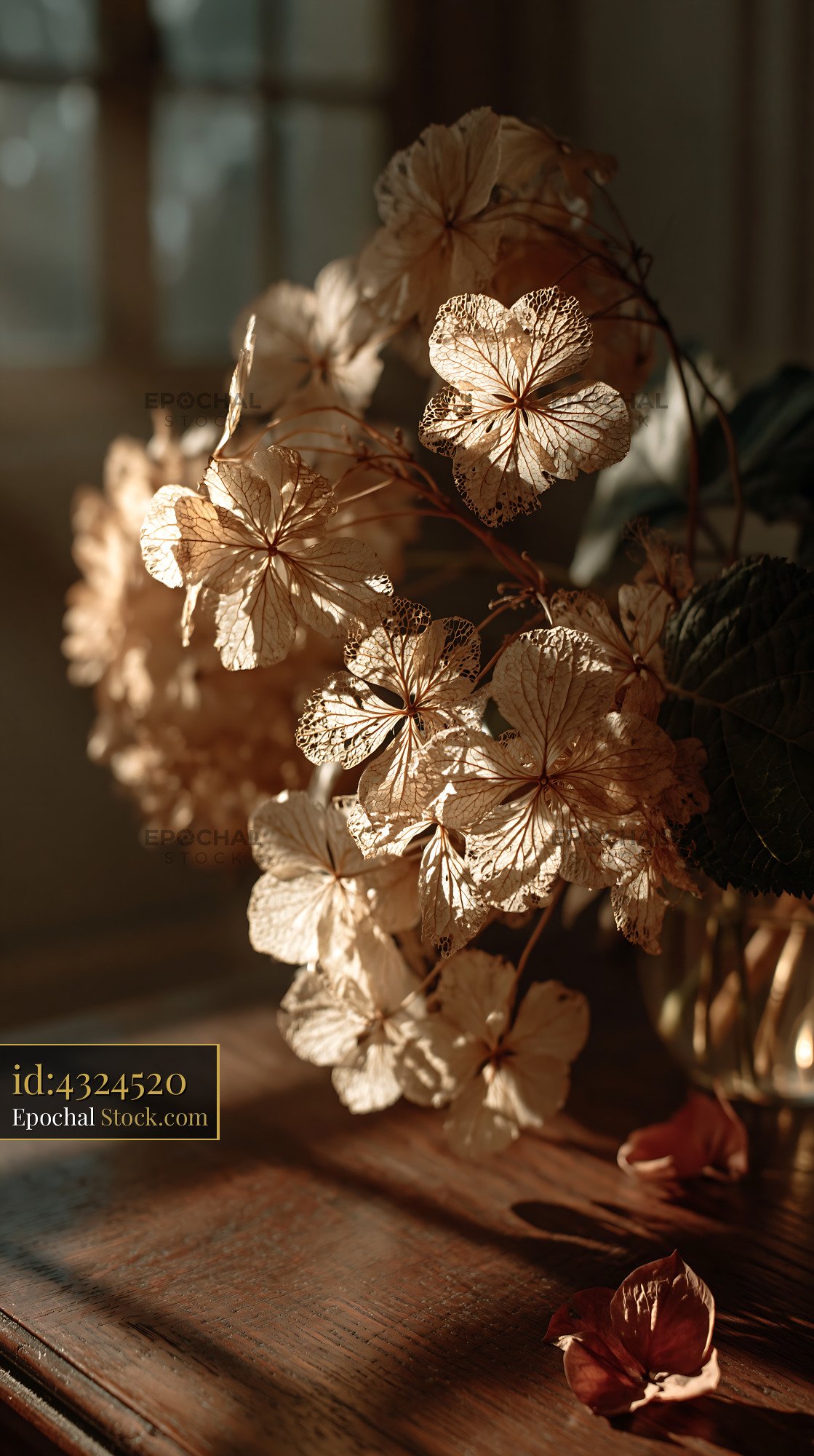 Delicate dried hydrangea petals in golden light, evoking themes of transience and memory like footprints in deep snow.