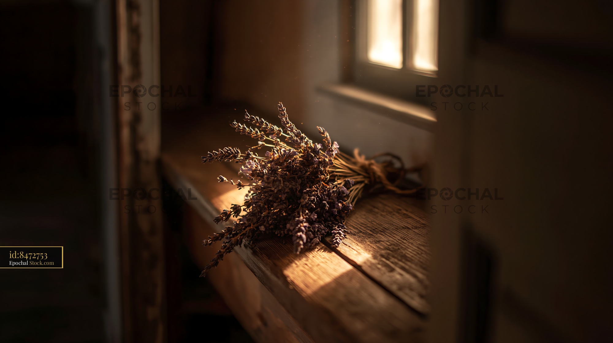 A bunch of dried lavender rests on an old wooden windowsill, bathed in golden afternoon light, evoking a sense of calm, nostalgia, and rustic country living.