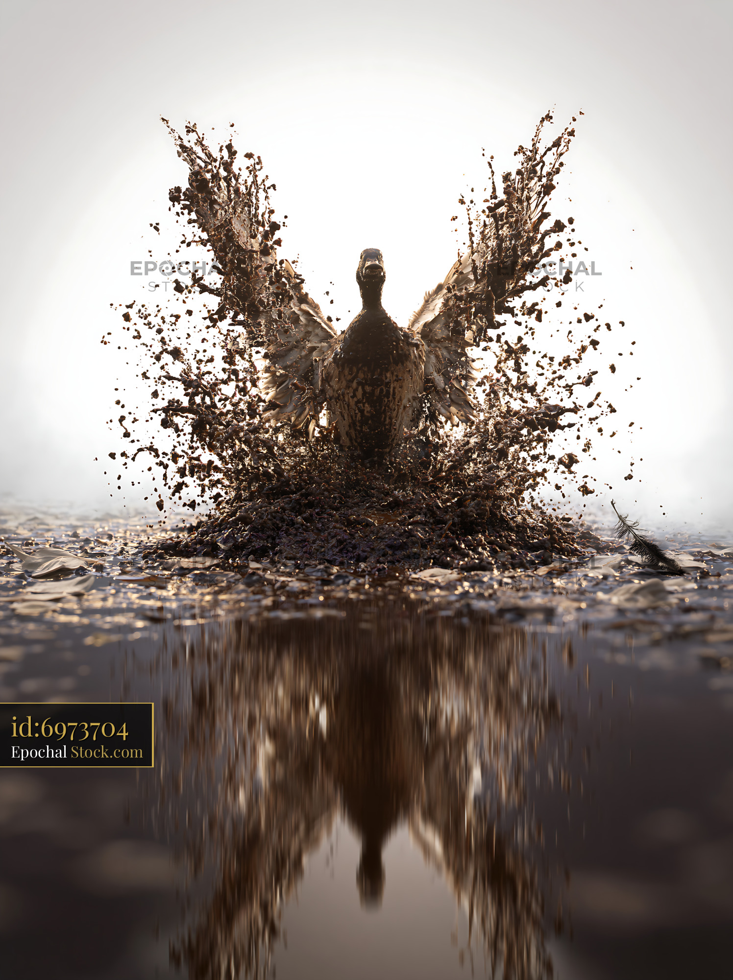 Duck rising from a mud puddle with a dramatic splash of dirty water