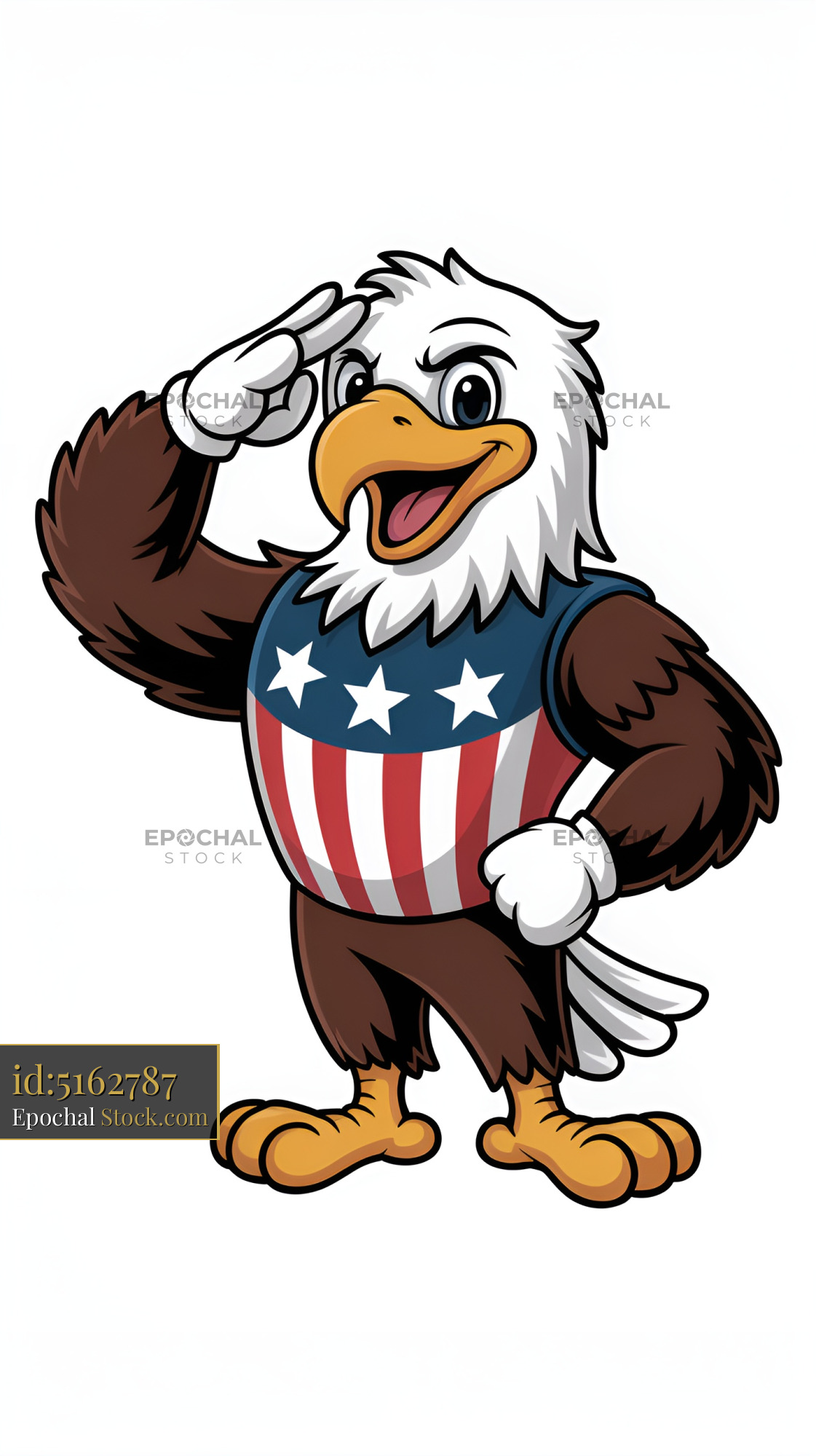 A cartoon eagle stands upright and salutes. It wears a shirt with red, white, and blue colors. The eagle's wings are down. This scene suggests a celebration of patriotism.