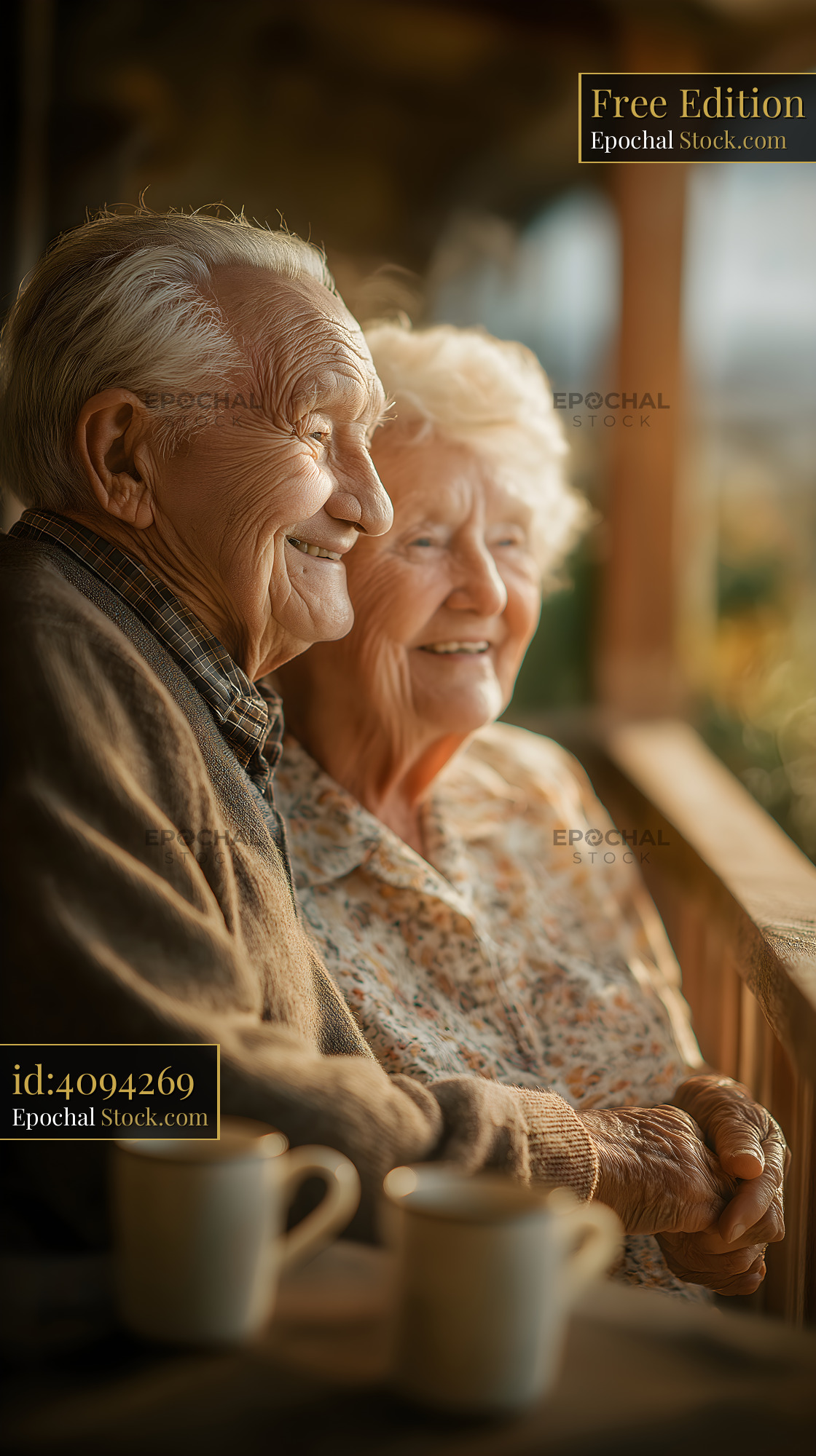 An elderly couple sits close on a porch, smiling at each other and enjoying their time together. Two cups are placed on the table near them, with sunlight shining down.
