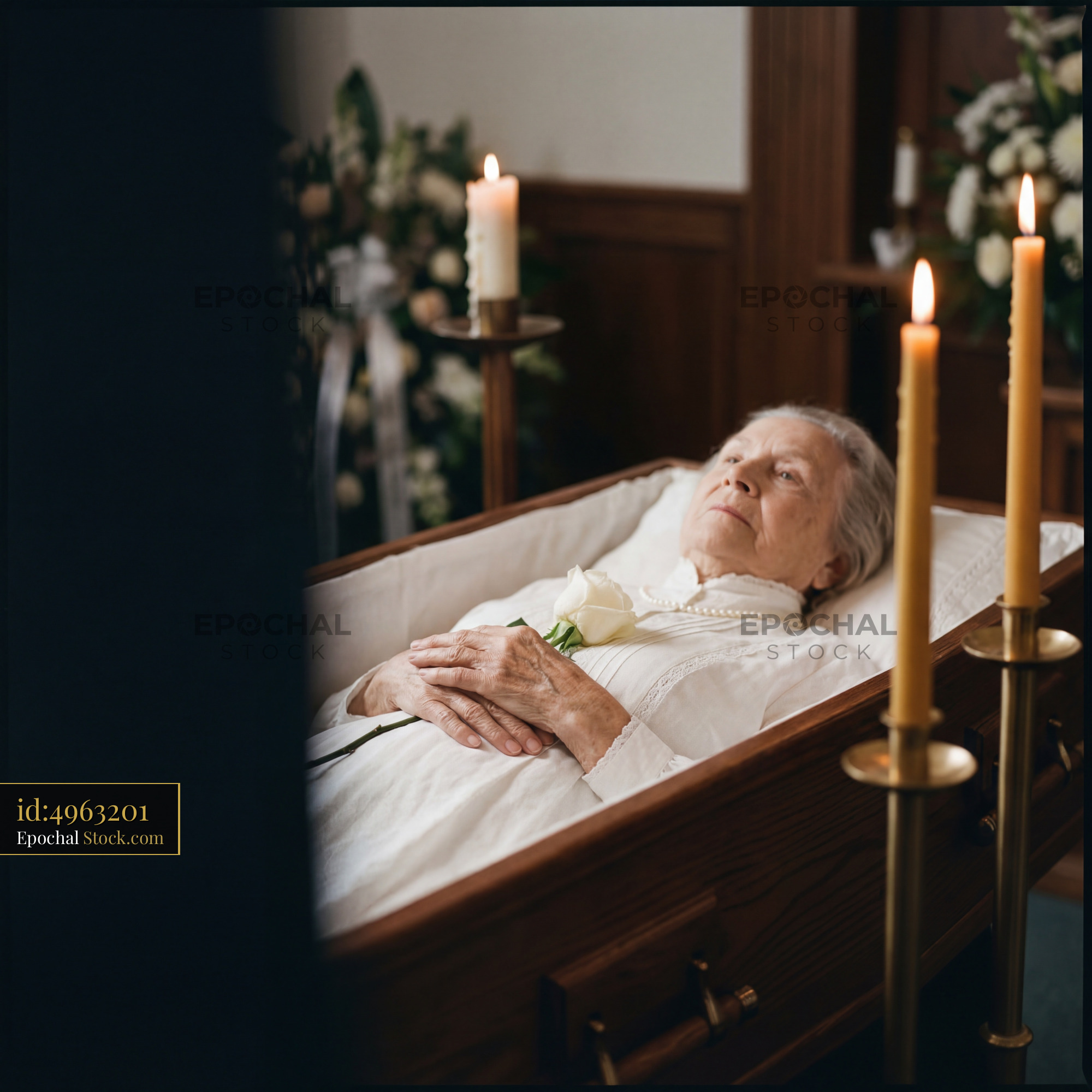 A woman rests in a casket with hands folded. She wears a white dress and a necklace. Two candles burn quietly beside her. Flowers decorate the space. The scene feels somber and reflective.