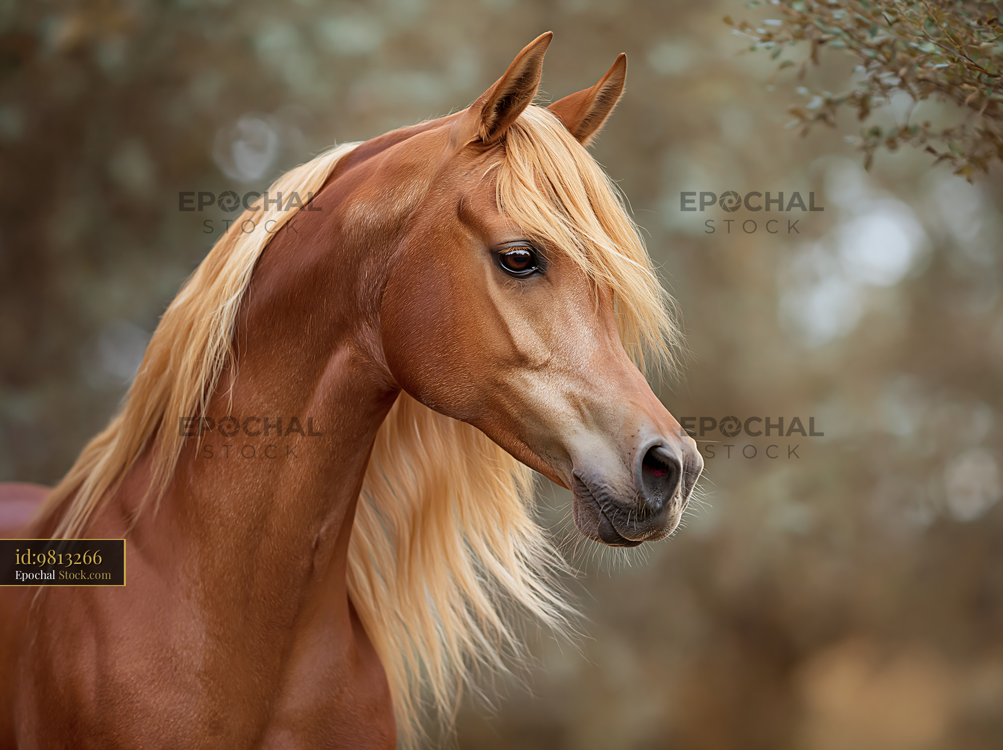 A noble chestnut horse with a flowing flaxen mane stands gracefully in a soft-lit forest, embodying elegance, freedom, and the serene beauty of nature.