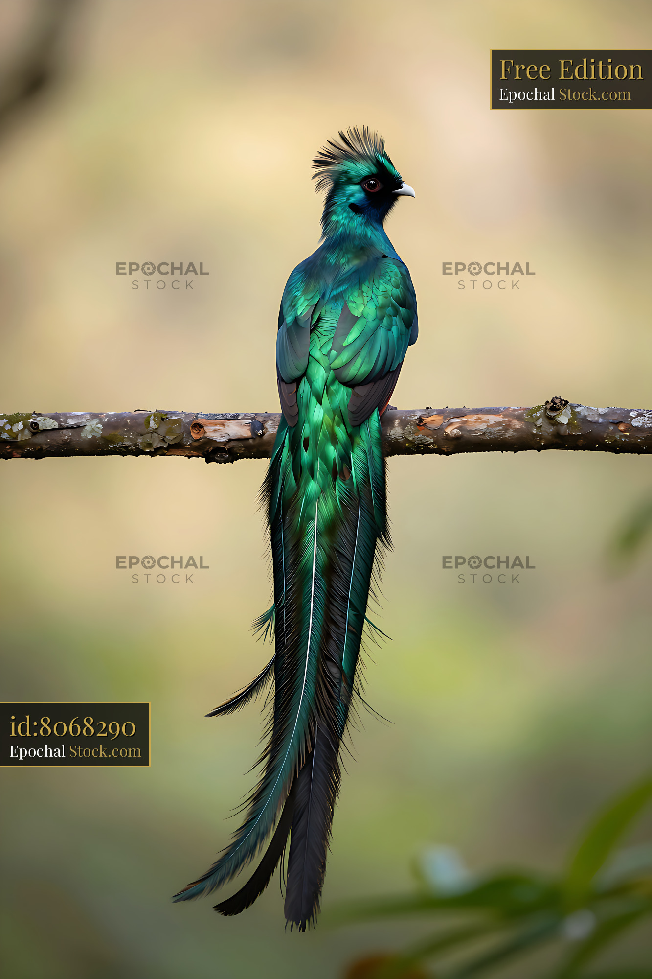 A vibrant peacock displays its magnificent emerald and turquoise plumage while standing upright on a lichen-covered branch. The bird's distinctive crest rises proudly against a soft, blurred background, capturing the elegance and exotic beauty of this remarkable creature in its natural poise.