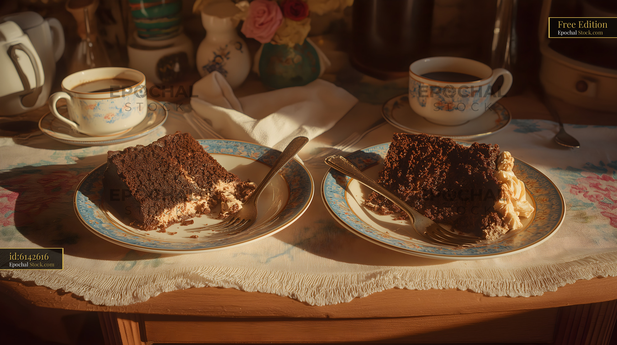 Two plates with cake sit on a table set for coffee. Each plate has a slice of cake. Two cups of coffee are also present. This scene shows a quiet afternoon moment.