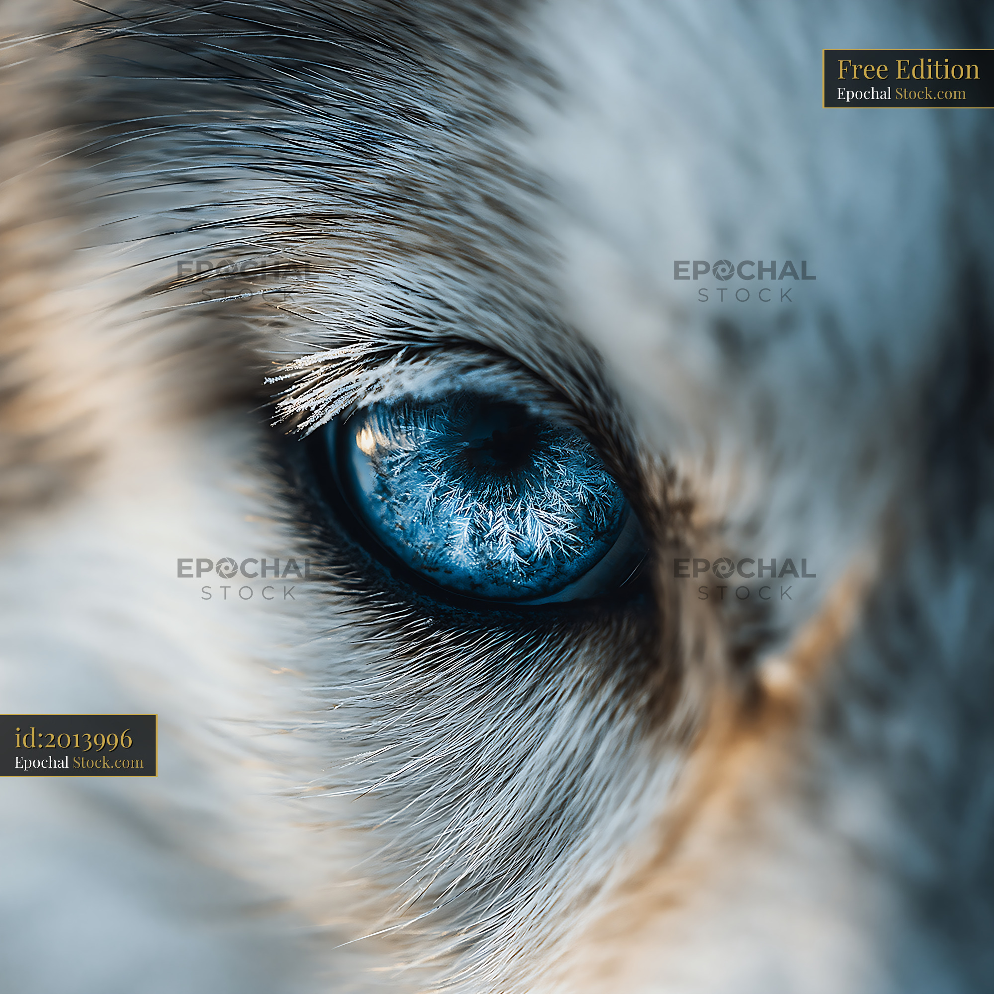 A detailed macro shot of a bright blue canine eye surrounded by thick fur and delicate ice crystals, capturing the essence of arctic winter and wild animal instinct.