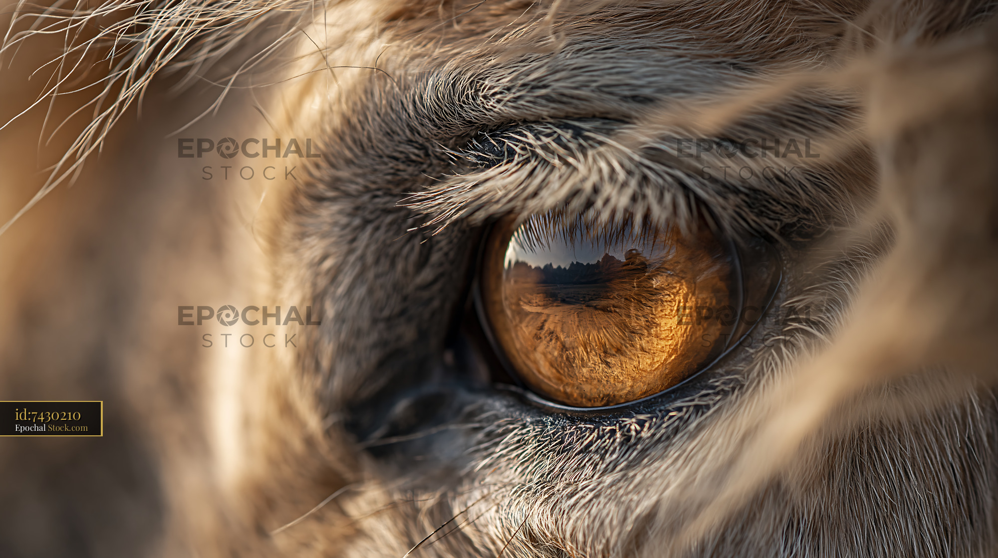 A detailed macro shot of a lion's golden eye capturing the reflection of the vast savannah, symbolizing the deep connection between wild predators and their natural habitat.