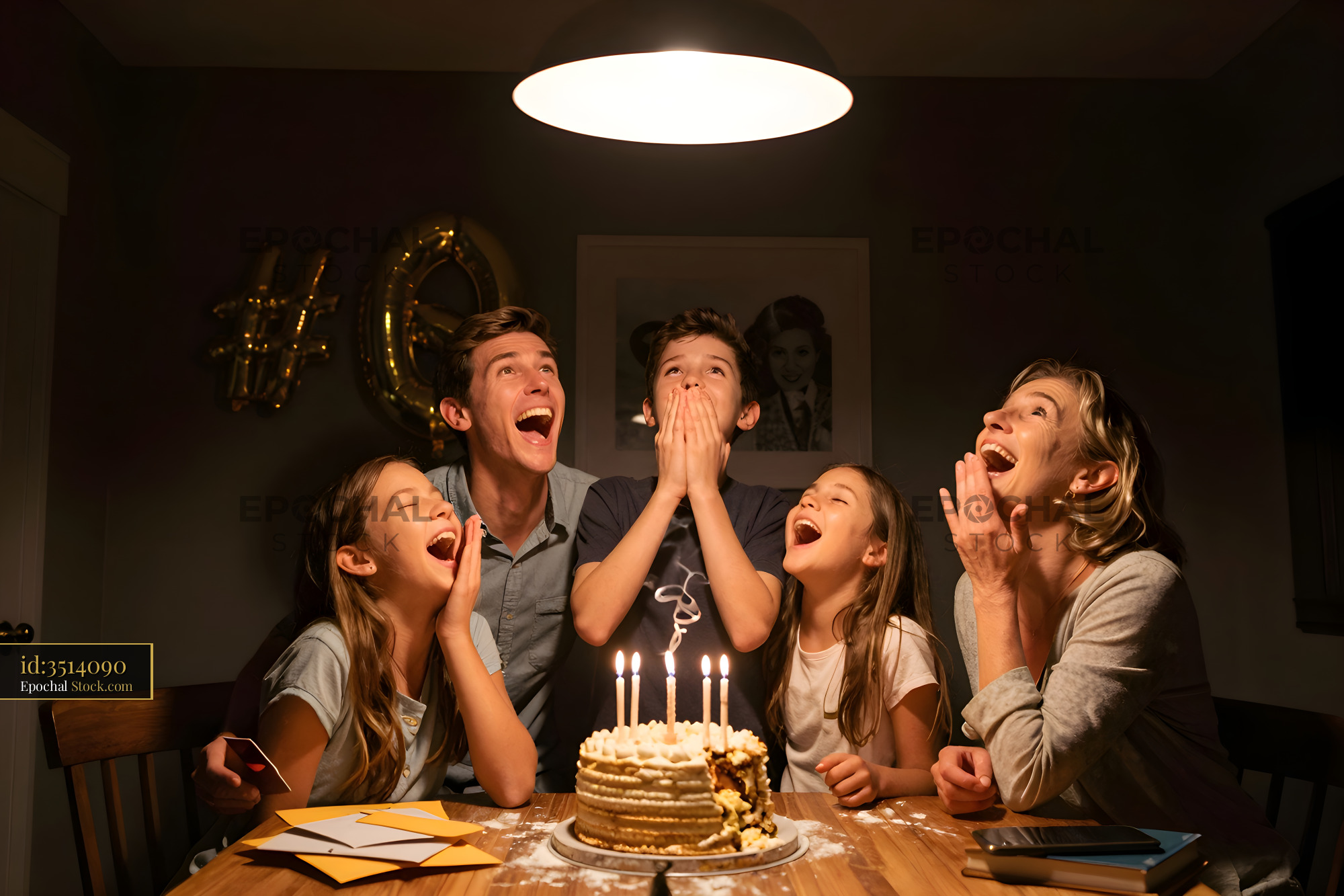 Family celebrates a birthday with cake and laughter at home Premium Stock Photo