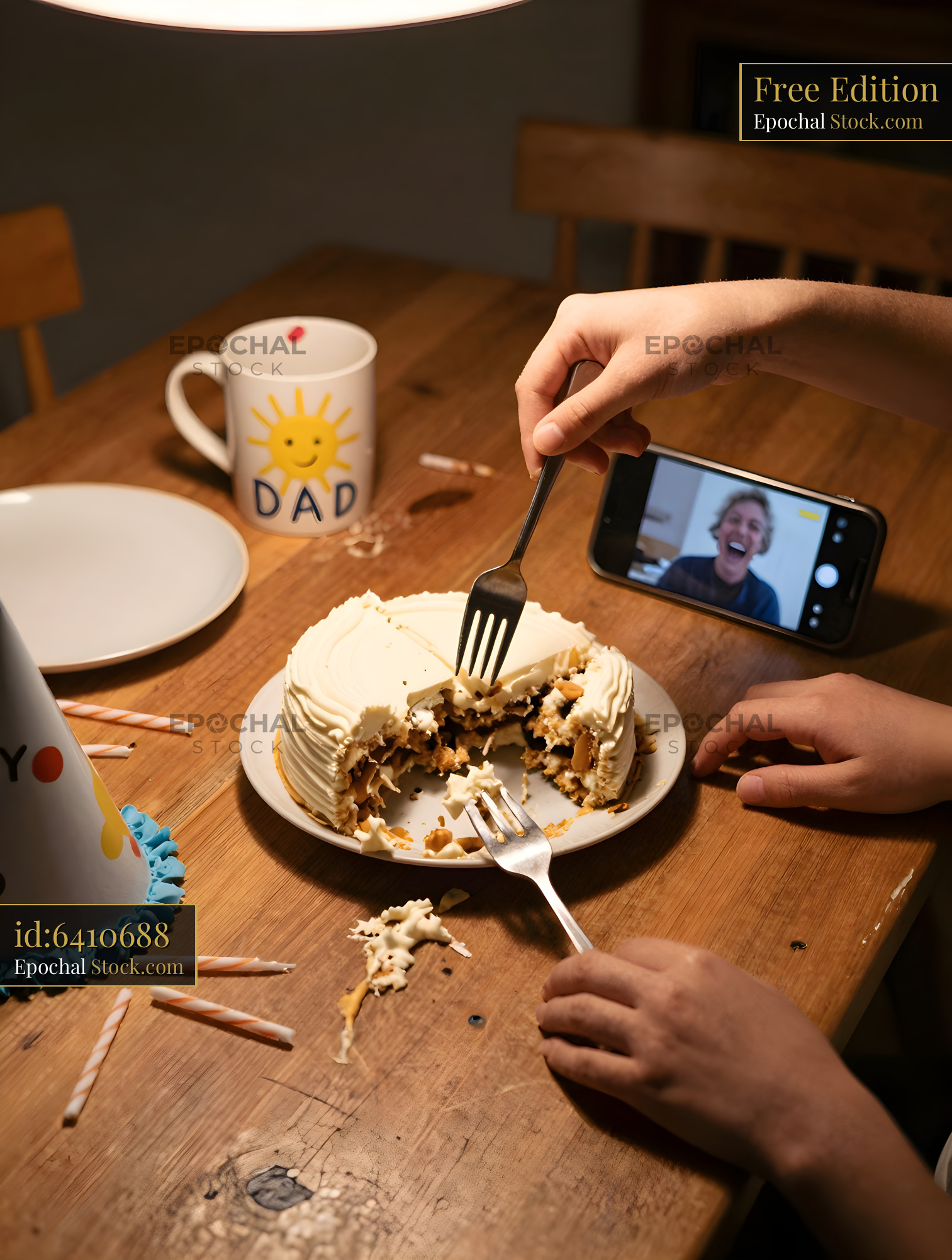 Family celebration with cake and video call for dad Free Premium Stock Image