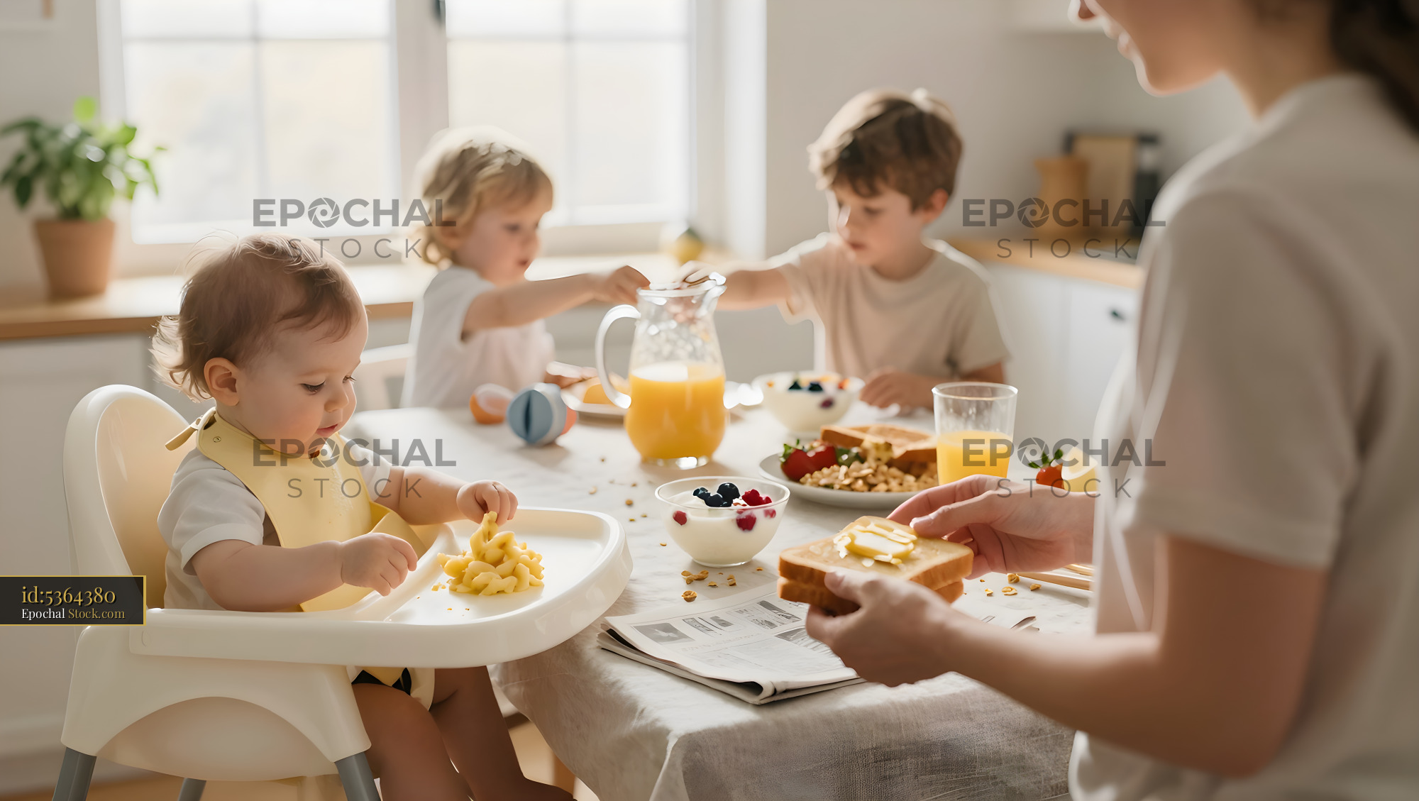 Three children share a breakfast table with a parent preparing food. They eat toast, fruit, and drink juice in a cozy kitchen. Sunlight shines through the windows.
