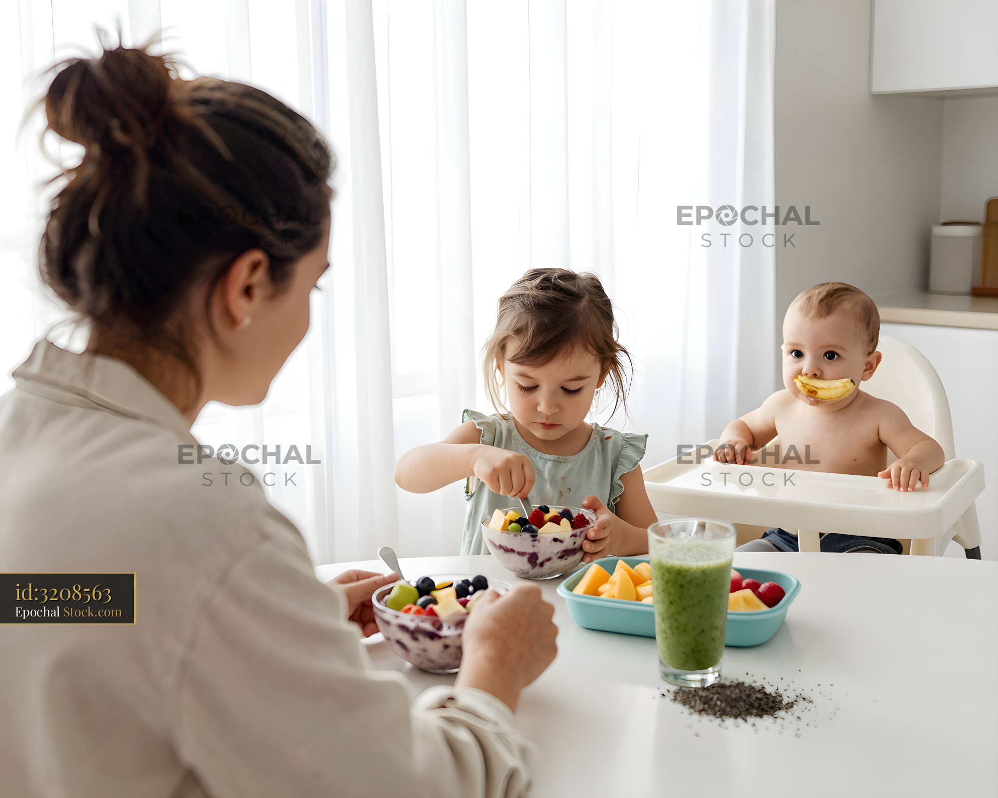 A woman sits at a table with two children. The older child is eating yogurt with fruit. The younger child is seated in a high chair and observes. Smoothies sit nearby.