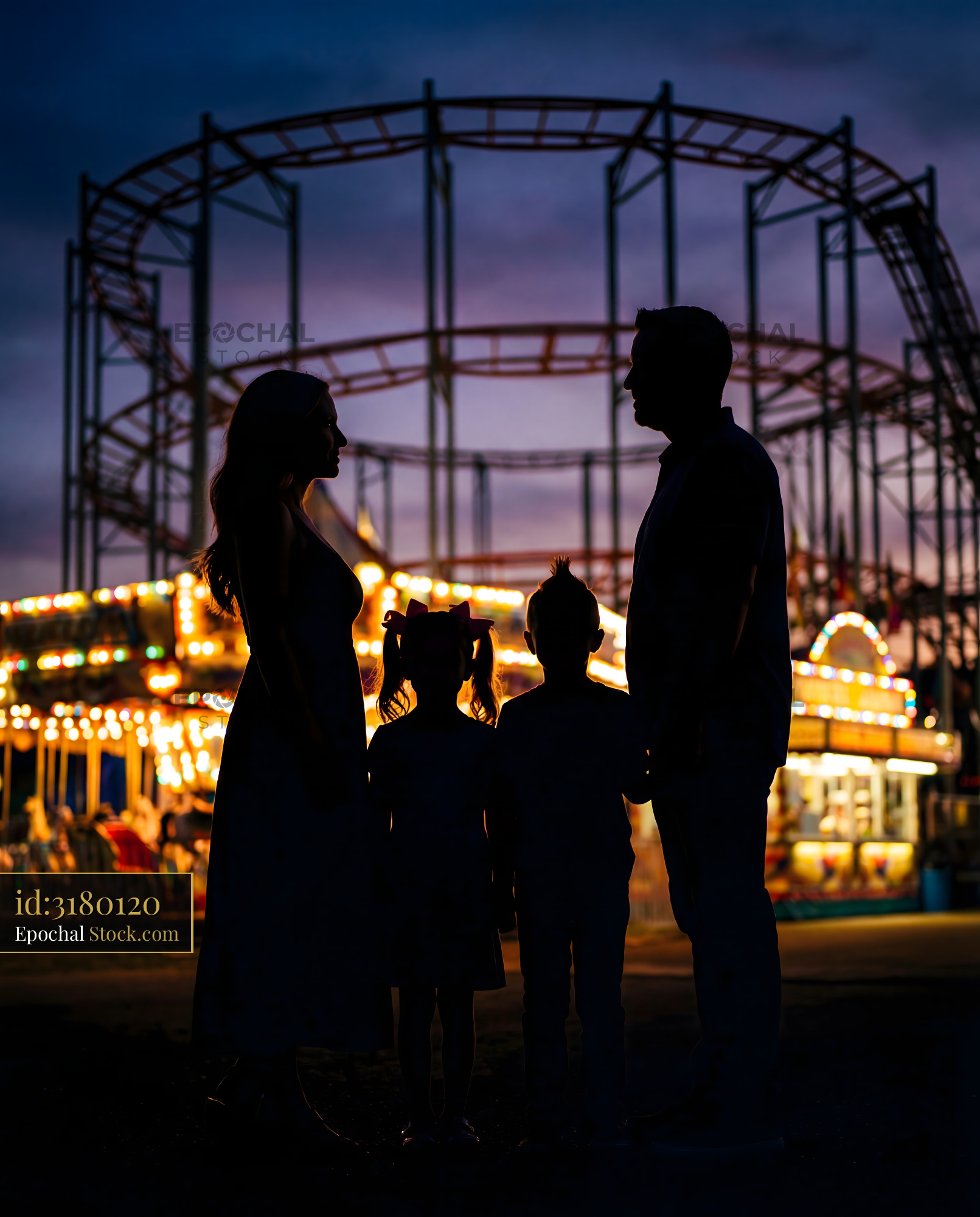 A family stands together in front of amusement rides at twilight. The silhouettes show them holding hands while enjoying time at the park. Colorful lights glow around the rides.