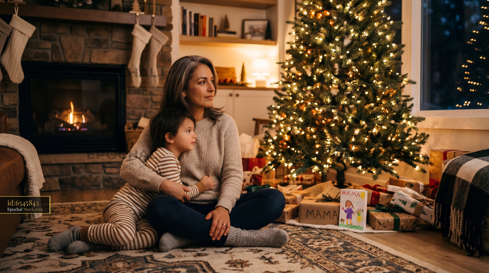A woman sits on the floor with a child by the Christmas tree. They are surrounded by gifts and a warm fireplace. It is nighttime and the tree is bright with lights.