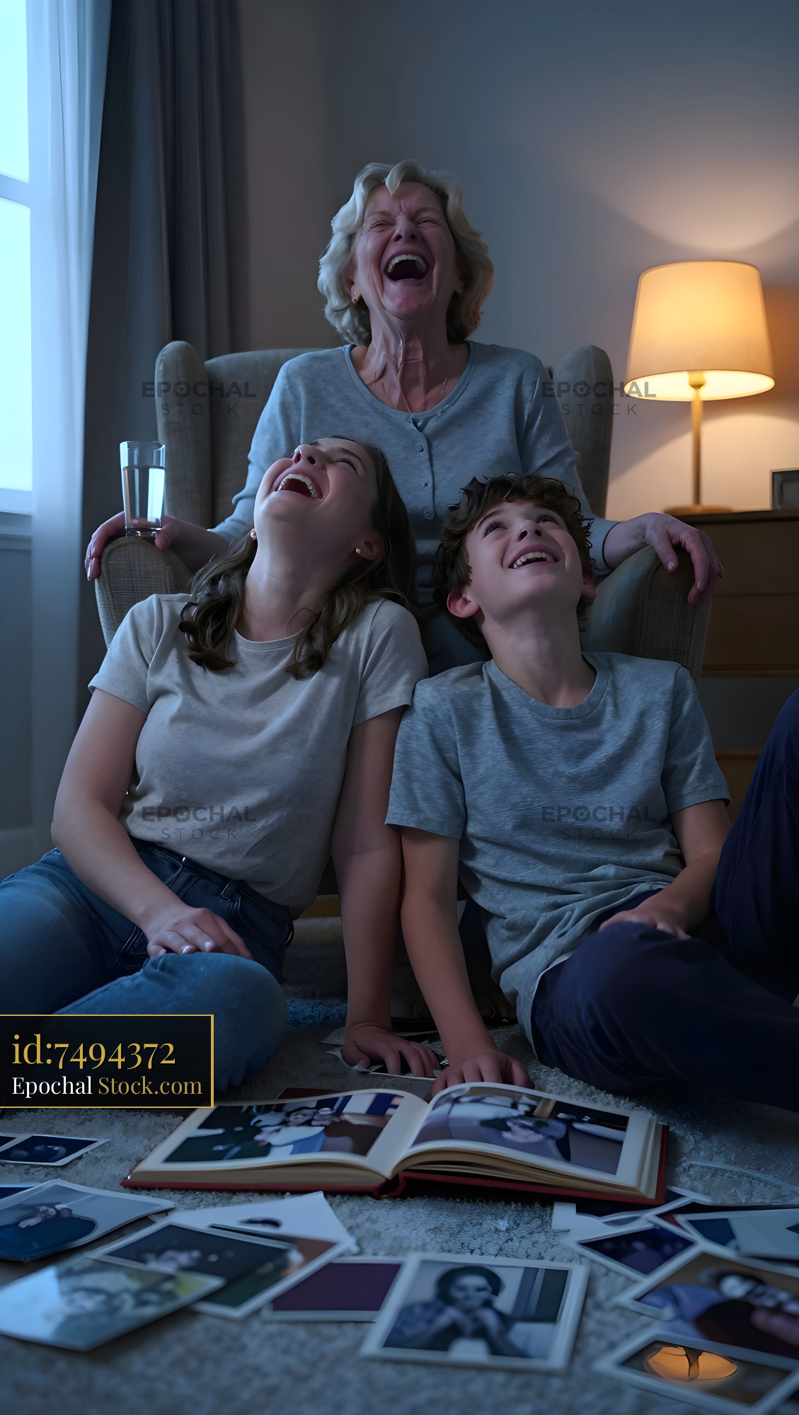 A group of three family members sits on the floor and laughs. They look through a photo album while an elderly woman sits in a chair. A lamp lights up the room softly.