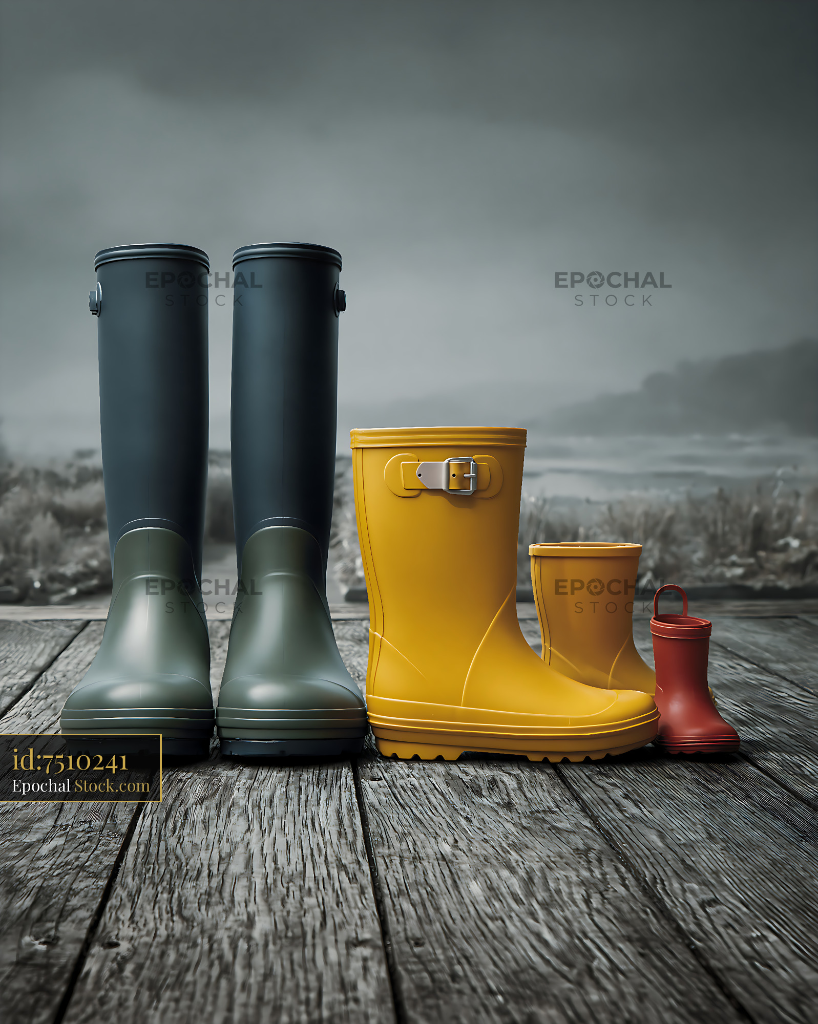 A row of colorful rubber boots representing a family stands on a rustic wooden pier under a moody sky, symbolizing togetherness, growth, and the anticipation of a shared outdoor adventure.