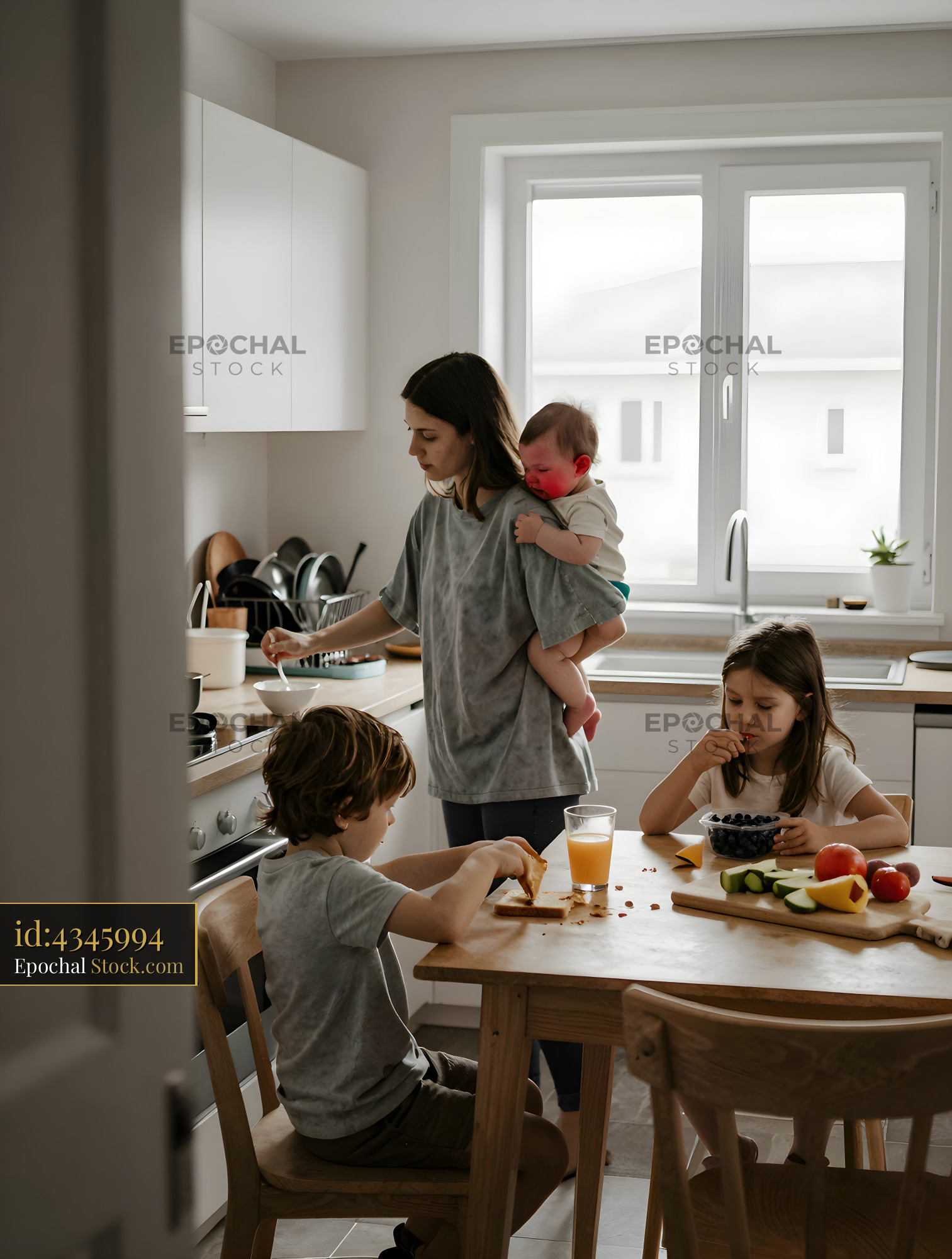 A woman with a baby on her shoulder stands by the stove. Two children sit at a table eating breakfast. They enjoy fruits and drinks. Sunlight enters through a window in the kitchen.