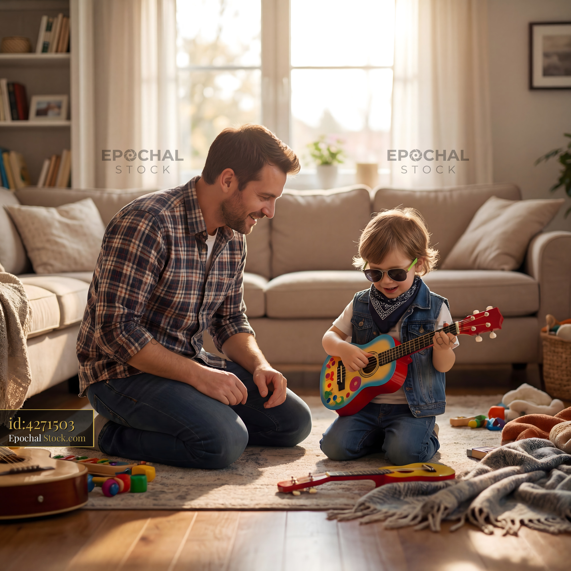 A man and his child enjoy music together in a living room. The child plays a small guitar while the man watches and smiles. Toys and instruments are scattered on the floor.